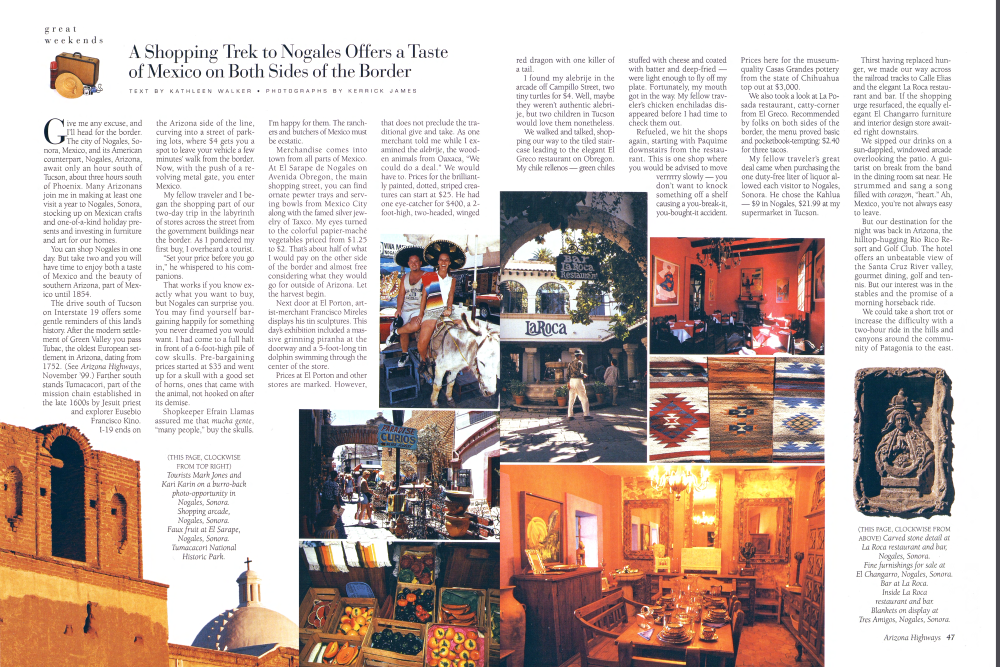 Give me any excuse, and I'll head for the border. The city of Nogales, Sonora, Mexico, and its American counterpart, Nogales, Arizona, await only an hour south of Tucson, about three hours south of Phoenix. Many Arizonans join me in making at least one visit a year to Nogales, Sonora, stocking up on Mexican crafts and one-of-a-kind holiday presents and investing in furniture and art for our homes. You can shop Nogales in one day. But take two and you will have time to enjoy both a taste of Mexico and the beauty of southern Arizona, part of Mexico until 1854.