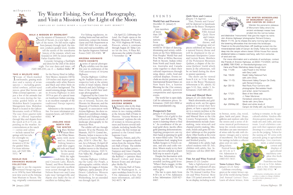 The exhibit will run through January 30 at the Phoenix Art Museum, 1625 N. Central Ave., Phoenix, before it moves to the Center for Creative Photography, 1030 N. Olive Rd., Tucson, for a February 19-April 20 run. On June 24, Celebrating the Tradition moves to the Museum of Northern Arizona, 3101 Ν. Fort Valley Rd., Flagstaff, until November 5. Arizona Highways: Celebrating Our Land, Our People, a photographic exhibit which represents the pages of Arizona Highways, opens January 29 at Desert Caballeros Western Museum, 21 N. Frontier St., Wickenburg, for an extended run through April 16.