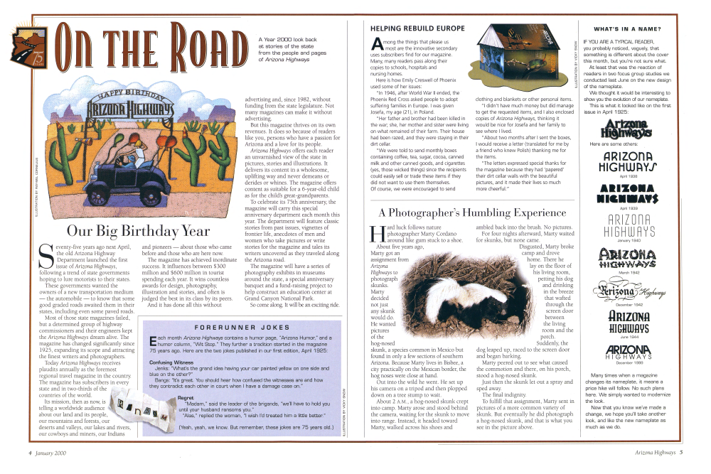 Seventy-five years ago next April, the old Arizona Highway Department launched the first issue of Arizona Highways, following a trend of state governments hoping to lure motorists to their states. These governments wanted the owners of a new transportation medium - the automobile to know that some good graded roads awaited them in their states, including even some paved roads. Most of those state magazines failed, but a determined group of highway commissioners and their engineers kept the Arizona Highways dream alive. The magazine has changed significantly since 1925, expanding its scope and attracting the finest writers and photographers. Today Arizona Highways receives plaudits annually as the foremost regional travel magazine in the country. The magazine has subscribers in every state and in two-thirds of the countries of the world and pioneers - about those who came before and those who are here now. The magazine has achieved inordinate success. It influences between $300 million and $600 million in tourist spending each year. It wins countless awards for design, photography, illustration and stories, and often is judged the best in its class by its peers. And it has done all this without A Year 2000 look back at stories of the state from the people and pages of Arizona Highways advertising and, since 1982, without funding from the state legislature. Not many magazines can make it without advertising. But this magazine thrives on its own revenues. It does so because of readers like you, persons who have a passion for Arizona and a love for its people. Arizona Highways offers each reader an unvarnished view of the state in pictures, stories and illustrations. It delivers its content in a wholesome, uplifting way and never demeans or derides or whines. The magazine offers content as suitable for a 6-year-old child as for the child's great-grandparents. To celebrate its 75th anniversary, the magazine will carry this special anniversary department each month this year. The department will feature classic stories from past issues, vignettes of frontier life, anecdotes of men and women who take pictures or write stories for the magazine and tales its writers uncovered as they traveled along the Arizona road. The magazine will have a series of photography exhibits in museums around the state, a special anniversary banquet and a fund-raising project to help construct an education center at Grand Canyon National Park. So come along. It will be an exciting ride.