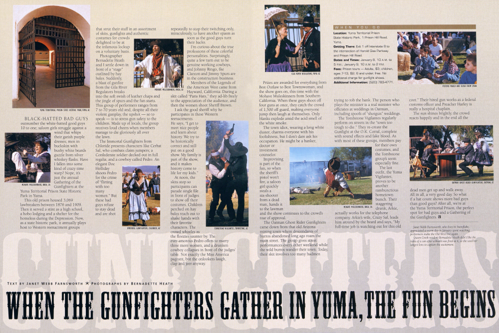 This old prison housed 3,069 lawbreakers between 1876 and 1909. Then it served a stint as a high school, a hobo lodging and a shelter for the homeless during the Depression. Now, as a state historic park, it annually plays host to Western reenactment groups that strut their stuff in an assortment of skits, gunfights and authentic costumes for crowds delighted to be at the infamous lockup on a voluntary basis. Photographer Bernadette Heath and I settle down in front of a "stage" outlined by hay bales. Suddenly, a blast of gunfire from the Gila River Regulators breaks into the soft swish of leather chaps and the jingle of spurs and the fun starts. This group of performers ranges from 7 to 70 years old and, despite all their violent gunplay, the upshot - so to speak - is to stress gun safety to the children. Made up of locals, the group receives loud cheers when members manage to die gloriously all over the lawn.