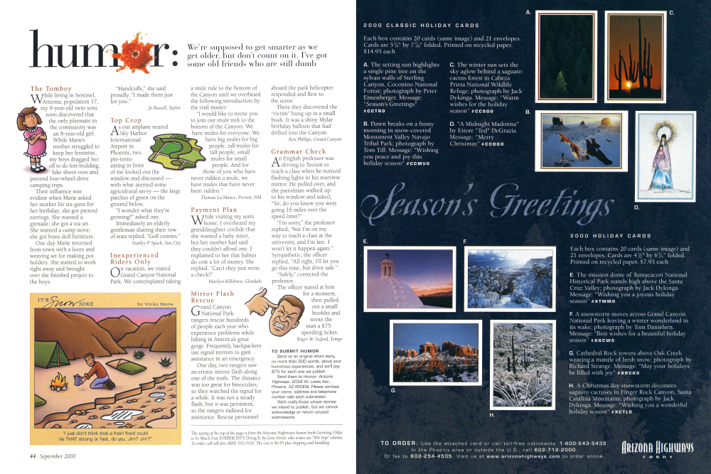 Each box contains 20 cards (same image) and 21 envelopes. Cards are 4½" by 6/4" folded. Printed on recycled paper. $7.95 each E. The mission dome of Tumacacori National Historical Park stands high above the Santa Cruz Valley; photograph by Jack Dykinga. Message: "Wishing you a joyous holiday season" #XTMMO F. A snowstorm moves across Grand Canyon National Park leaving a winter wonderland in its wake; photograph by Tom Danielsen. Message: "Best wishes for a beautiful holiday season #XGCWO G. Cathedral Rock towers above Oak Creek wearing a mantle of fresh snow; photograph by Richard Strange. Message: "May your holidays be filled with joy" #XRCKO A Christmas day snowstorm decorates saguaro cactuses in Finger Rock Canyon, Santa Catalina Mountains; photograph by Jack Dykinga. Message: "Wishing you a wonderful holiday season" #XCTLO TO ORDER: Use the attached card or call toll-free nationwide, 1-800-543-5432 In the Phoenix area or outside the U.S., call 602-712-2000. Or fax to 602-254-4505. Visit us at www.arizonahighways.com to order online.