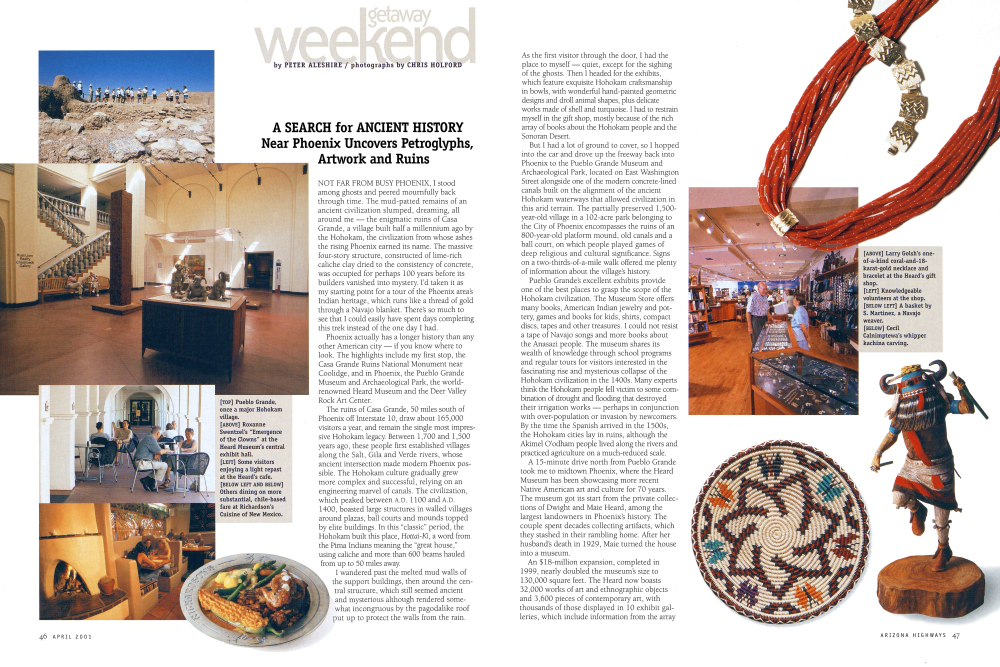 NOT FAR FROM BUSY PHOENIX, I stood among ghosts and peered mournfully back through time. The mud-patted remains of an ancient civilization slumped, dreaming, all around me the enigmatic ruins of Casa Grande, a village built half a millennium ago by the Hohokam, the civilization from whose ashes the rising Phoenix earned its name. The massive four-story structure, constructed of lime-rich caliche clay dried to the consistency of concrete, was occupied for perhaps 100 years before its builders vanished into mystery. I'd taken it as my starting point for a tour of the Phoenix area's Indian heritage, which runs like a thread of gold through a Navajo blanket. There's so much to see that I could easily have spent days completing this trek instead of the one day I had. Phoenix actually has a longer history than any other American city if you know where to look. The highlights include my first stop, the Casa Grande Ruins National Monument near Coolidge, and in Phoenix, the Pueblo Grande Museum and Archaeological Park, the worldrenowned Heard Museum and the Deer Valley Rock Art Center.