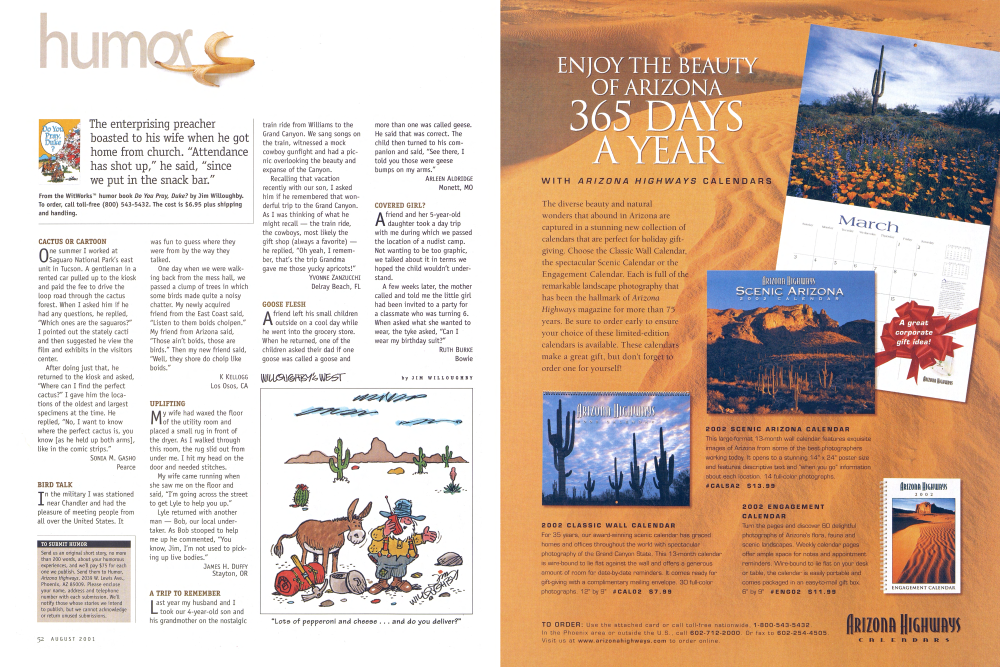 Turn the pages and discover 60 delightful photographs of Arizona's flora, fauna and scenic landscapes. Weekly calendar pages offer ample space for notes and appointment reminders. Wire-bound to lie flat on your desk or table, the calendar is easily portable and comes packaged in an easy-to-mail gift box. 6" by 9" #ENG02 $11.99 TO ORDER: Use the attached card or call toll-free nationwide, 1-800-543-5432. In the Phoenix area or outside the U.S., call 602-712-2000. Or fax to 602-254-4505. Visit us at www.arizonahighways.com to order online.