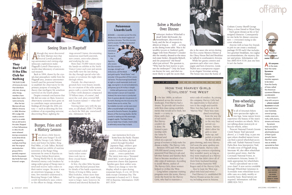 Not all of Arizona's hikers view spectacular sights on two legs. Some nature lovers experience the beauty of the state's natural wonders on wheels. We're not talking about motorcycle or bicycle wheels, either. Prescott National Forest's Groom Creek Nature Trail (pictured above), a 1.5-mile loop, is just one spot where disabled nature lovers can find a paved wheelchair-accessible trail. Kaibab National Forest's Parks Rest Area Interpretive Trail, 10 miles west of Flagstaff along Interstate 40, also offers wheelchair travelers good views. And the Coronado National Forest, in southeastern Arizona, boasts 12 trails appropriate for wheelchairs. Need a specialized van to tote your chair? A new service available through Wheelchair Getaways in Scottsdale rents wheelchair-accessible vans on a daily, weekly or monthly basis. Reservations are required. Information: toll-free (888) 824-7413.