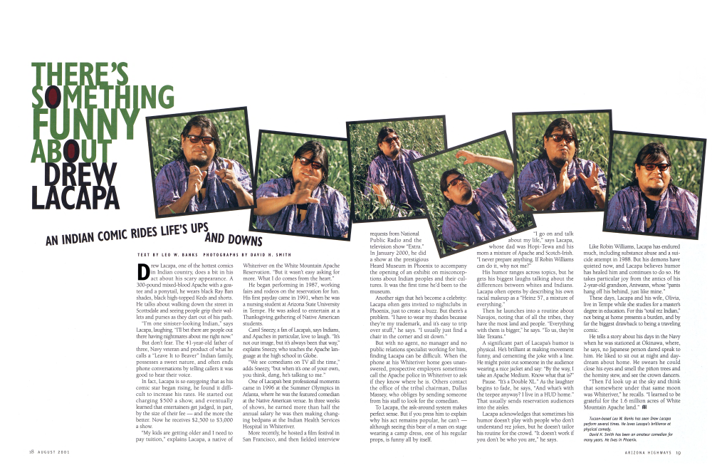 Drew Lacapa, one of the hottest comics in Indian country, does a bit in his act about his scary appearance. A 300-pound mixed-blood Apache with a goatee and a ponytail, he wears black Ray Ban shades, black high-topped Keds and shorts. He talks about walking down the street in Scottsdale and seeing people grip their wallets and purses as they dart out of his path. "I'm one sinister-looking Indian," says Lacapa, laughing. "I'll bet there are people out there having nightmares about me right now." But don't fear. The 41-year-old father of three, Navy veteran and product of what he calls a "Leave It to Beaver" Indian family, possesses a sweet nature, and often ends phone conversations by telling callers it was good to hear their voice. In fact, Lacapa is so easygoing that as his comic star began rising, he found it difficult to increase his rates. He started out charging $500 a show, and eventually learned that entertainers get judged, in part, by the size of their fee - and the more the better. Now he receives $2,500 to $3,000 a show. "My kids are getting older and I need to pay tuition," explains Lacapa, a native of Whiteriver on the White Mountain Apache Reservation. "But it wasn't easy asking for more. What I do comes from the heart." He began performing in 1987, working fairs and rodeos on the reservation for fun. His first payday came in 1991, when he was a nursing student at Arizona State University in Tempe. He was asked to entertain at a Thanksgiving gathering of Native American students. Carol Sneezy, a fan of Lacapa's, says Indians, and Apaches in particular, love to laugh. "It's not our image, but it's always been that way," explains Sneezy, who teaches the Apache language at the high school in Globe. "We see comedians on TV all the time," adds Sneezy, "but when it's one of your own, you think, dang, he's talking to me." One of Lacapa's best professional moments came in 1996 at the Summer Olympics in Atlanta, where he was the featured comedian at the Native American venue. In three weeks of shows, he earned more than half the annual salary he was then making changing bedpans at the Indian Health Services Hospital in Whiteriver. More recently, he hosted a film festival in San Francisco, and then fielded interview requests from National Public Radio and the television show “Extra.” In January 2000, he did a show at the prestigious Heard Museum in Phoenix to accompany the opening of an exhibit on misconceptions about Indian peoples and their cultures. It was the first time he'd been to the museum.