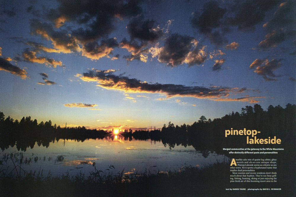 Merged communities at the gateway to the White Mountains offer distinctly different pasts and personalities marble-cake mix of quaint log cabins, glitzy motels and oh-so-cute antique shops. Pinetop-Lakeside seems as cohesive as any other town. Yet it sports a hyphenated name that implies dual personalities. Most tourists and recent residents don't think much about that hyphen. They're too busy golfing, fishing, hunting, skiing or just enjoying the pine-fresh air of this booming resort area in the White Mountains, 180 miles northeast of Phoenix. But an old-timer or seasoned tourist like me remembers when Pinetop and Lakeside were separated by 2 miles of undeveloped forest. Over the years, small businesses, government buildings and strip malls transformed those woods into a continuous commercial strip. Finally, in 1984, the physically merged towns incorporated to form the single community of PinetopLakeside with shared schools and municipal services.
