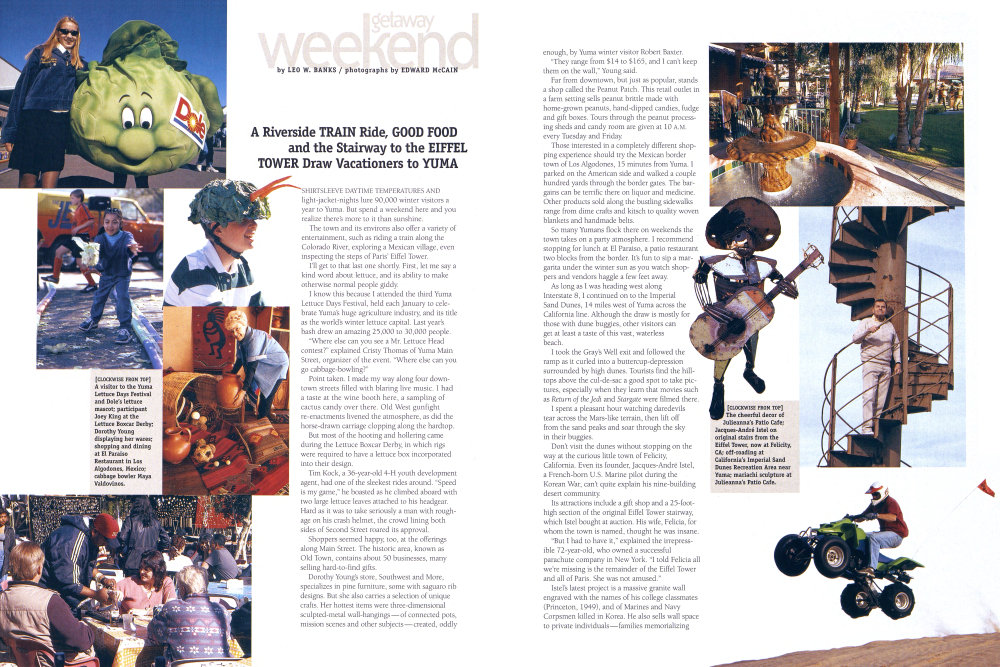 SHIRTSLEEVE DAYTIME TEMPERATURES AND light-jacket-nights lure 90,000 winter visitors a year to Yuma. But spend a weekend here and you realize there's more to it than sunshine. The town and its environs also offer a variety of entertainment, such as riding a train along the Colorado River, exploring a Mexican village, even inspecting the steps of Paris' Eiffel Tower. I'll get to that last one shortly. First, let me say a kind word about lettuce, and its ability to make otherwise normal people giddy. I know this because I attended the third Yuma Lettuce Days Festival, held each January to celebrate Yuma's huge agriculture industry, and its title as the world's winter lettuce capital. Last year's bash drew an amazing 25,000 to 30,000 people. "Where else can you see a Mr. Lettuce Head contest?" explained Cristy Thomas of Yuma Main Street, organizer of the event. "Where else can you go cabbage-bowling?" Point taken. I made my way along four downtown streets filled with blaring live music. I had a taste at the wine booth here, a sampling of cactus candy over there. Old West gunfight re-enactments livened the atmosphere, as did the horse-drawn carriage clopping along the hardtop. But most of the hooting and hollering came during the Lettuce Boxcar Derby, in which rigs were required to have a lettuce box incorporated into their design. Tim Kock, a 36-year-old 4-H youth development agent, had one of the sleekest rides around. "Speed is my game," he boasted as he climbed aboard with two large lettuce leaves attached to his headgear. Hard as it was to take seriously a man with roughaverage on his crash helmet, the crowd lining both sides of Second Street roared its approval. Shoppers seemed happy, too, at the offerings along Main Street. The historic area, known as Old Town, contains about 50 businesses, many selling hard-to-find gifts. Dorothy Young's store, Southwest and More, specializes in pine furniture, some with saguaro rib designs. But she also carries a selection of unique crafts. Her hottest items were three-dimensional sculpted-metal wall-hangingsof connected pots, mission scenes and other subjects-created, oddly enough, by Yuma winter visitor Robert Baxter. “They range from $14 to $165, and I can't keep them on the wall,” Young said.