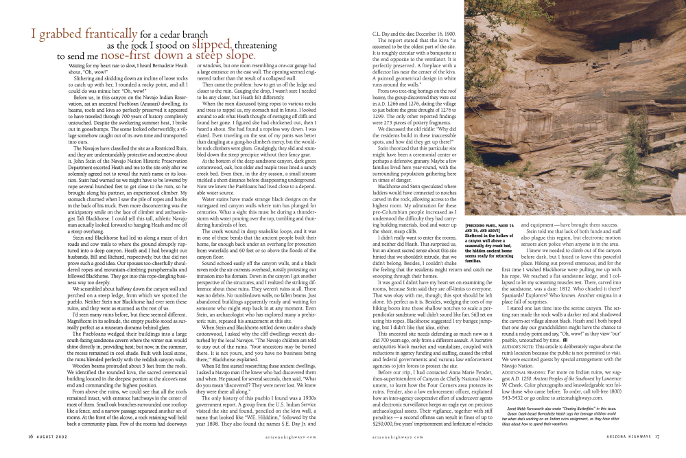 I grabbed frantically for a cedar branch as the rock I stood on slipped, threatening to send me nose-first down a steep slope. Waiting for my heart rate to slow, I heard Bernadette Heath shout, “Oh, wow!” Slithering and skidding down an incline of loose rocks to catch up with her, I rounded a rocky point, and all I could do was mimic her: “Oh, wow!” Before us, in this canyon on the Navajo Indian Reservation, sat an ancestral Puebloan (Anasazi) dwelling, its beams, roofs and kiva so perfectly preserved it appeared to have traveled through 700 years of history completely untouched. Despite the sweltering summer heat, I broke out in goosebumps. The scene looked otherworldly, a village somehow caught out of its own time and transported into ours.