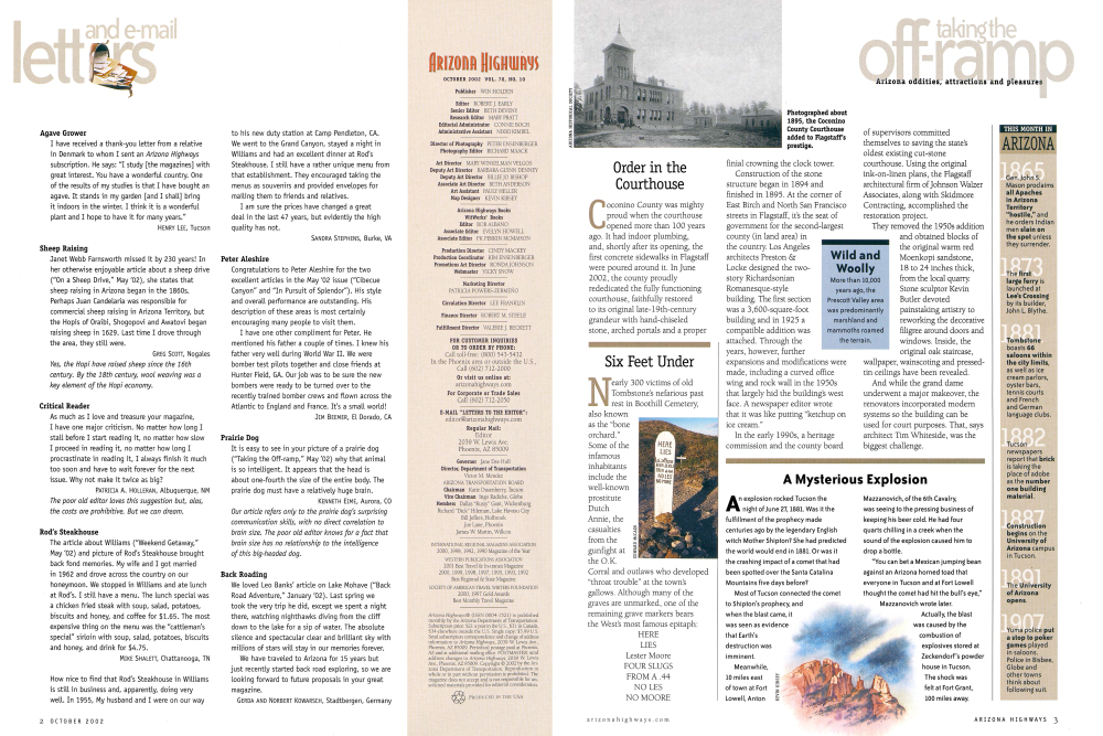 The article about Williams ("Weekend Getaway," May '02) and picture of Rod's Steakhouse brought back fond memories. My wife and I got married in 1962 and drove across the country on our honeymoon. We stopped in Williams and ate lunch at Rod's. I still have a menu. The lunch special was a chicken fried steak with soup, salad, potatoes, biscuits and honey, and coffee for $1.65. The most expensive thing on the menu was the "cattleman's special" sirloin with soup, salad, potatoes, biscuits and honey, and drink for $4.75. How nice to find that Rod's Steakhouse in Williams is still in business and, apparently, doing very well. In 1955, My husband and I were on our way to his new duty station at Camp Pendleton, CA. We went to the Grand Canyon, stayed a night in Williams and had an excellent dinner at Rod's Steakhouse. I still have a rather unique menu from that establishment. They encouraged taking the menus as souvenirs and provided envelopes for mailing them to friends and relatives. I am sure the prices have changed a great deal in the last 47 years, but evidently the high quality has not.