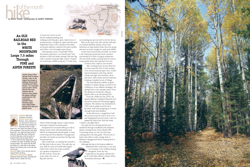 IT WAS JUST NOON AS WE left the trailhead parking area, walking south through a quiet, shady forest of ponderosa pine, Douglas fir, aspen and blue and Engelmann spruce trees. Bracken ferns lined an autumn pathway carpeted with pine needles and yellowand red-tinged aspen leaves. Anticipating a scenic, memorable White Mountains experience, two friends and I had decided to hike the Indian Springs Trail near Big Lake in eastern Arizona's high country. I hoped we would spot wildlife along the 7.5-mile loop,which winds through mature conifer forests and aspen-rimmed mountain parks. Designated for mountain biking as well as hiking, much of the well-maintained trail follows an abandoned railroad grade. A short connecting trail from Rainbow Campground provides convenient access from the Big Lake recreational area. After a half-mile, we reached the turnoff to the Big Lake lookout tower. This side trip, an easy walk for most of its half-mile length, ended with a short but steep scramble up a granite escarpment to the fire lookout. From the tower steps, the view of Big Lake and the surrounding area proved well worth the detour. Back on the main trail, after another half-mile, we reached Spillman Spring, where three hollowed-out logs channel water from the spring and serve as water troughs for cattle and wildlife. As the trail wound briefly downhill, we heard a soft twittering sound and found ourselves surrounded by a flock of pygmy nuthatches. The tiny birds, busily scouring bark for insects, hung upside-down and sideways from tree trunks as they called to one another. After crossing Forest Service Road 24, we discovered the first of what seemed to be several unusual aspen trees. Unlike typical tall aspens with long, slender trunks and high, thin branches, these had short, thick trunks and low branches forming a rounded crown of foliage. The trail followed a ribbon of green meadow to Indian Spring. Located at the confluence of two shallow drainages, the spring forms a tiny summer pond. From the spring we turned left, hiking a quarter-mile to an old railroad bed. From the 1940s into the 1970s, the Apache Railway Company's Maverick Line served the area's once-booming logging industry. The railway was dismantled in 1976, and its grade-turned-trail is elevated, wide and easygoing as it travels through forest and meadow. In late afternoon, a magnificent bull elk trotted across the trail in front of us and disappeared into the forest. Later we passed the West Fork Trail that leads 3 miles to the Black River. Our path left the old railroad bed and wandered through woodlands and meadows before crossing Forest Service Road 249E. Continuing north, we met two bicyclists coasting down the easy grade. This section of forest trail, about a mile, swings close to Rainbow Campground before looping back to the trailhead. Although the trip to the lookout added an additional mile, round-trip, to our trek, we returned to the trailhead feeling energized. From the tiny nuthatches to the grand, antlered elk, our 8.5-mile hike offered a classic White Mountains adventure. AH
