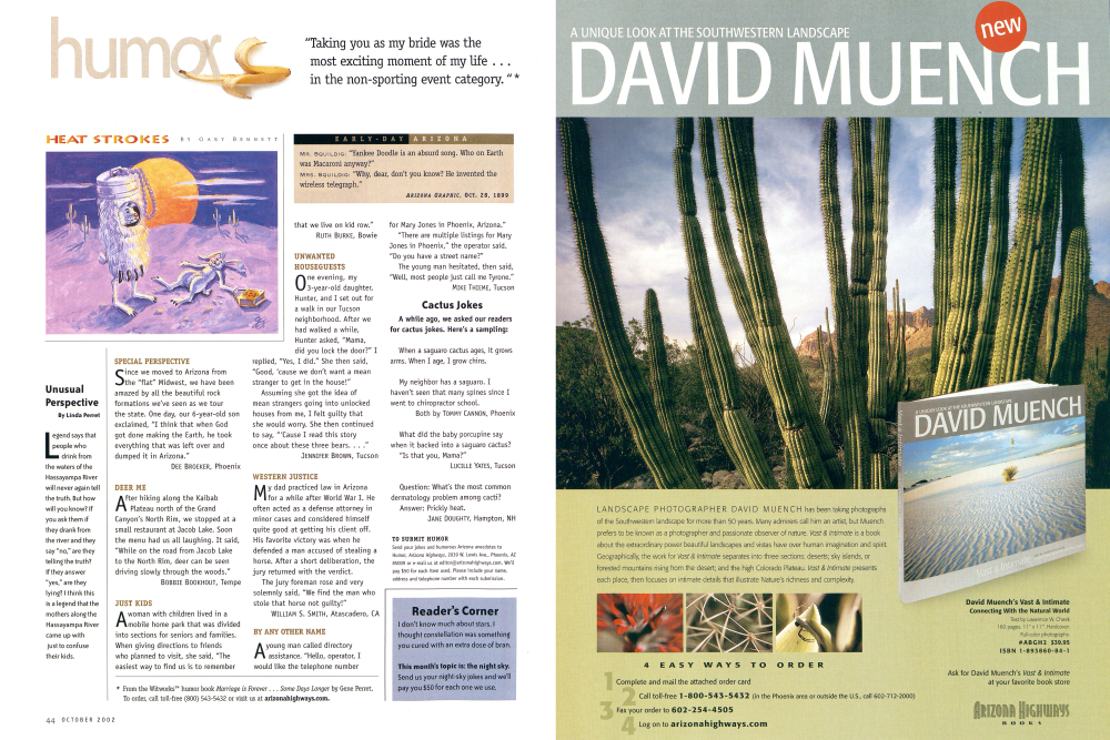 JANE DOUGHTY, Hampton, NH TO SUBMIT HUMOR Send your jokes and humorous Arizona anecdotes to Humor, Arizona Highways, 2039 W. Lewis Ave., Phoenix, AZ 85009 or e-mail us at [email protected]. We'll pay $50 for each item used. Please include your name, address and telephone number with each submission.