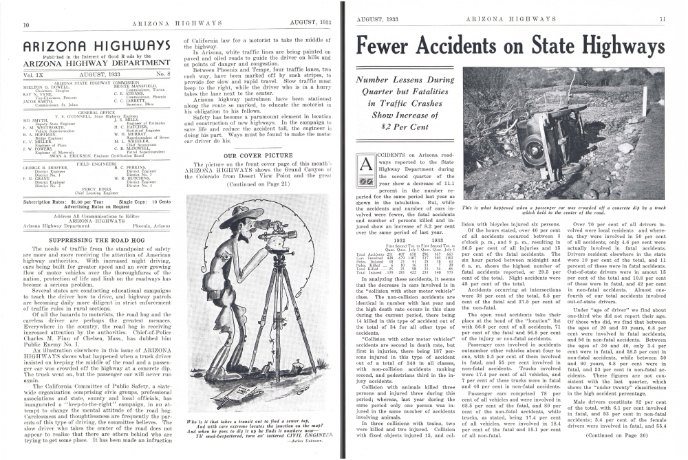 An illustration elsewhere in this issue of ARIZONA HIGHWAYS shows what happened when a truck driver insisted on keeping the middle of the road and a passenger car was crowded off the highway at a concrete dip. The truck went on, but the passenger car will never run again.The California Committee of Public Safety, a statewide organization comprising civic groups, professional associations and state, county and local officials, has inaugurated a "keep-to-the-right" campaign, in an attempt to change the mental attitude of the road hog. Carelessness and thoughtlessness are frequently the parents of this type of driving, the committee believes. The slow driver who takes the center of the road does not appear to realize that there are others behind who are trying to get some place. It has been made an infraction of California law for a motorist to take the middle of the highway.