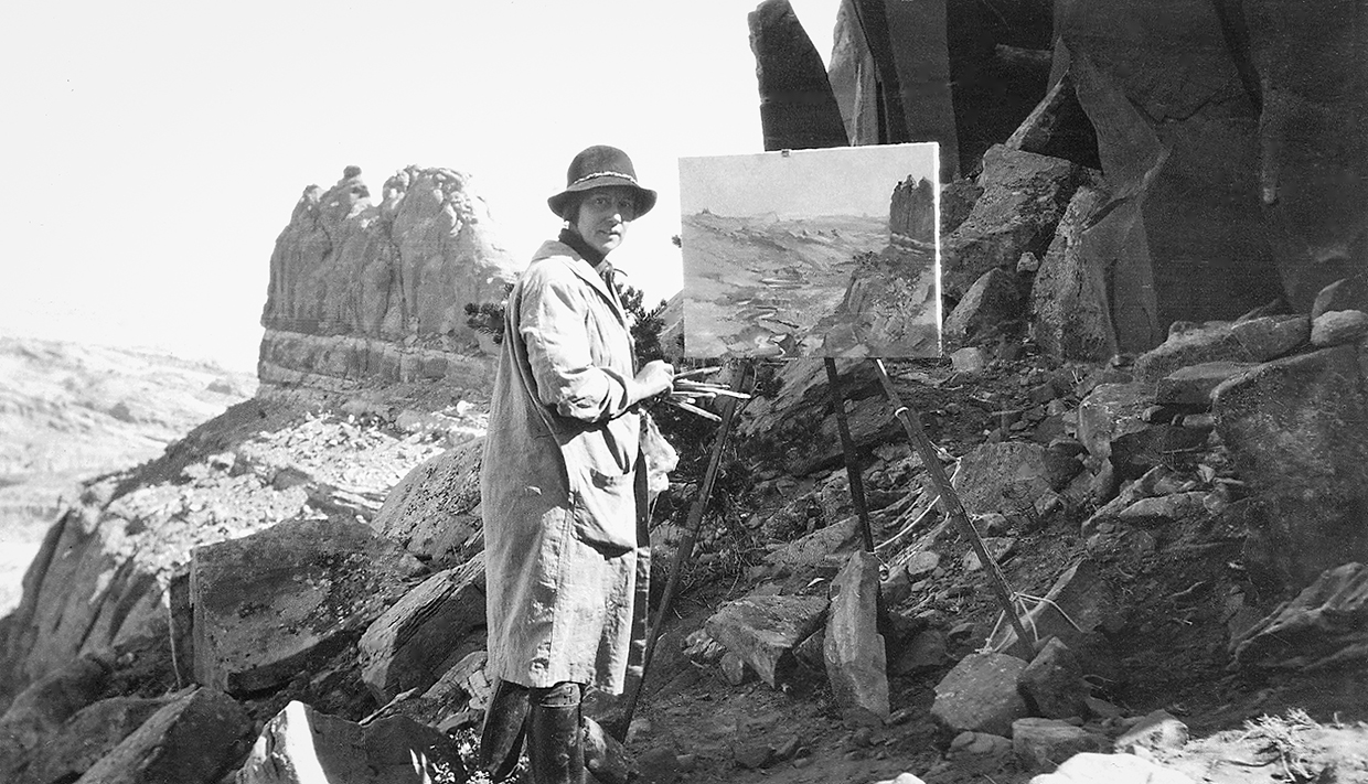 “I learned from members of the geodetic survey that no other white woman has ever been known to go within 20 miles of my spot on the rim,” she recalled of the latter site. “Four or five days later, Jess carried the [3-by-5-foot] canvas on the toe of his boot … along that rough terrain (there was no trail) the 20 miles to where our [Studebaker] was parked. … What an effort that was.”