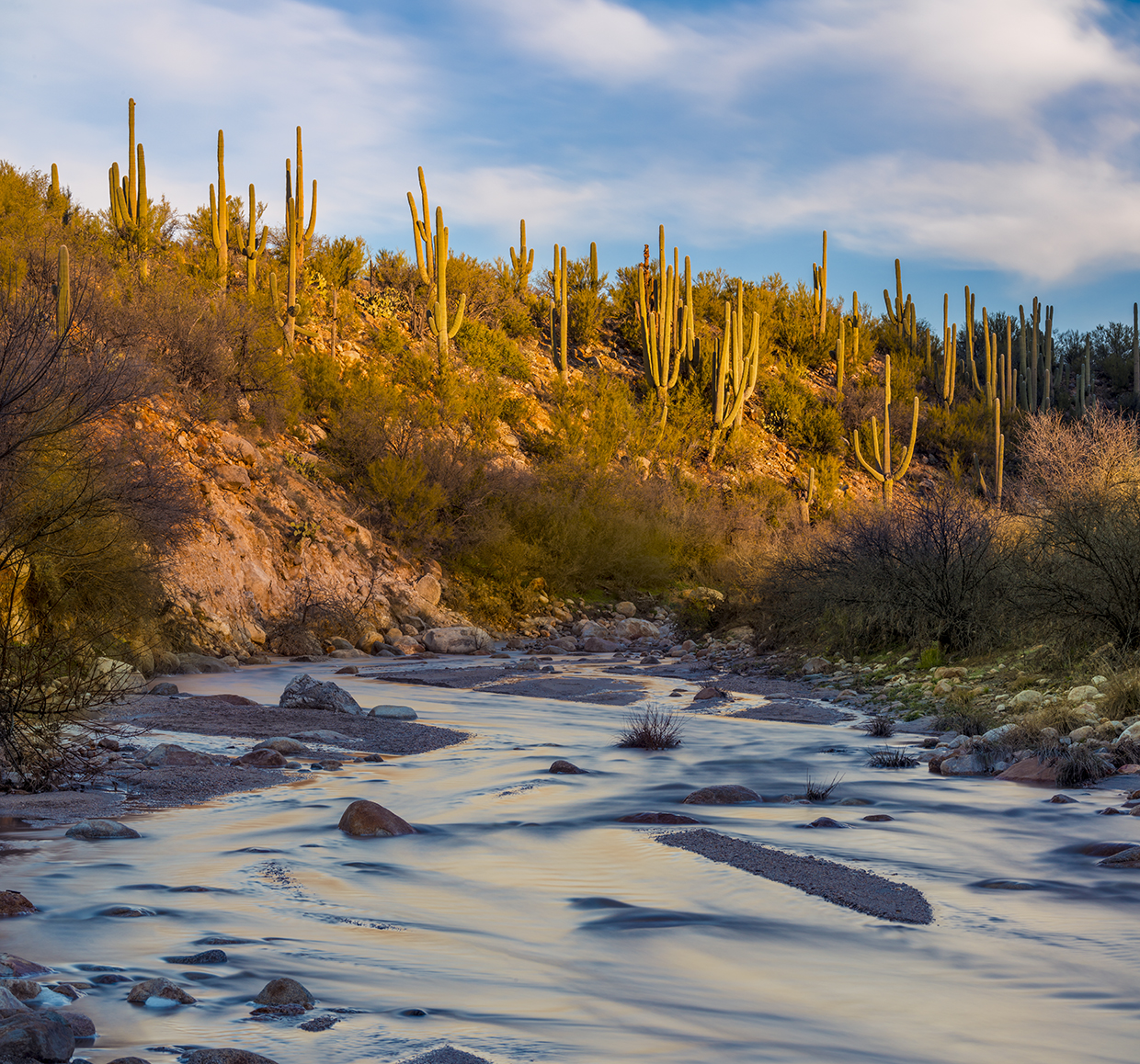This is the homestretch. And it’s the best part of the trail, especially if there’s running water in the wash. But even if there’s not, the riparian ecosystem spotlights the diversity of the Sonoran Desert and how beautiful it can be. Cottonwood and ash are the primary hardwoods. And the north bank is lined with clusters of massive saguaros, like dozens of NBA players standing side by side during the national anthem.