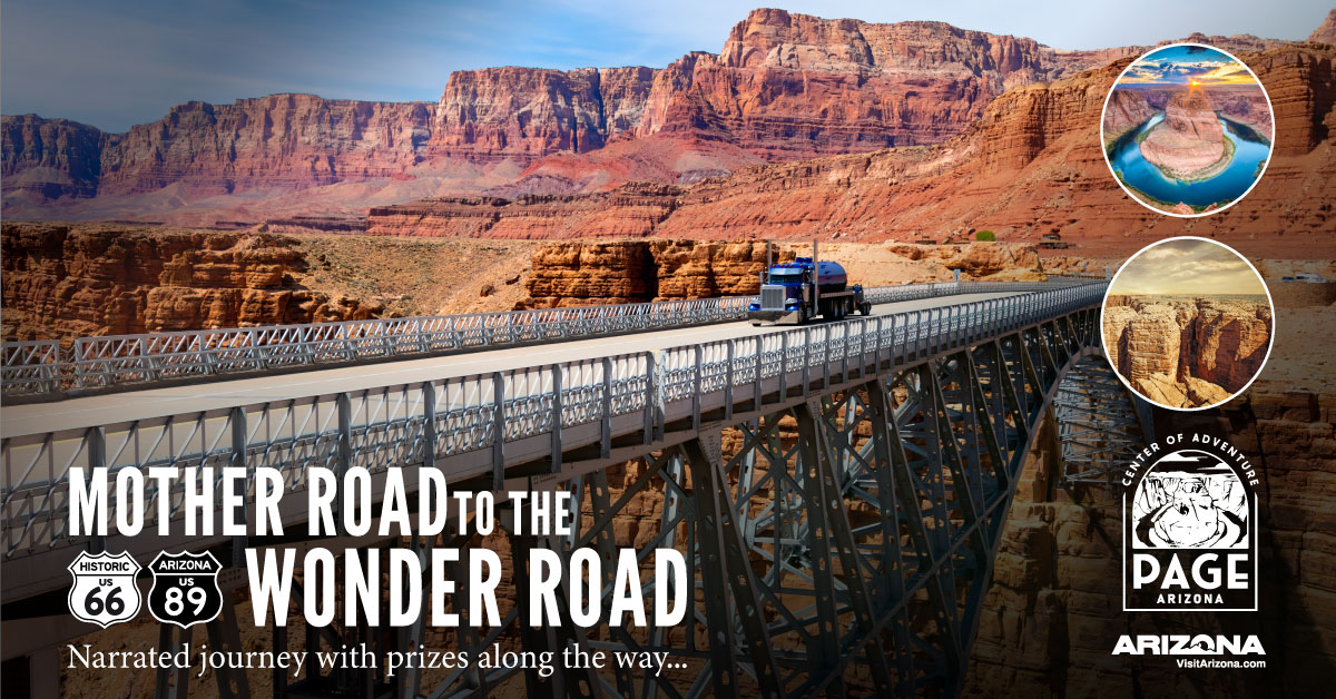 This free, gamified digital passport is your invitation to continue the Route 66 journey beyond Flagstaff along U.S. 89, leading to Page, Arizona—home of Horseshoe Bend, Lake Powell, Antelope Canyon slot canyons, and Glen Canyon Dam.