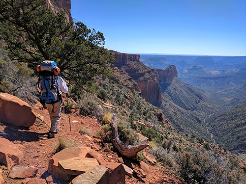 Don’t look down,” I mutter to myself as I look down. My stomach plummets at the dizzying view, and a chill shoots to my feet. I’m standing on a sloped, gravelly trail, inches from a 400-plus-foot plunge. Below, more sheer strata and screes descend like a wedding cake. My 40-pound backpack scrapes the rust-hued cliff, on my left, that rises 2,000 feet toward a dark-turquoise sky. In the distance, the “V”-shaped canyon below me opens to an immense, butte-studded landscape hiding the Colorado River in its depths. An obsidian raven floats past on a gentle updraft, its wings reflecting iridescent blue in the November Arizona sun.
