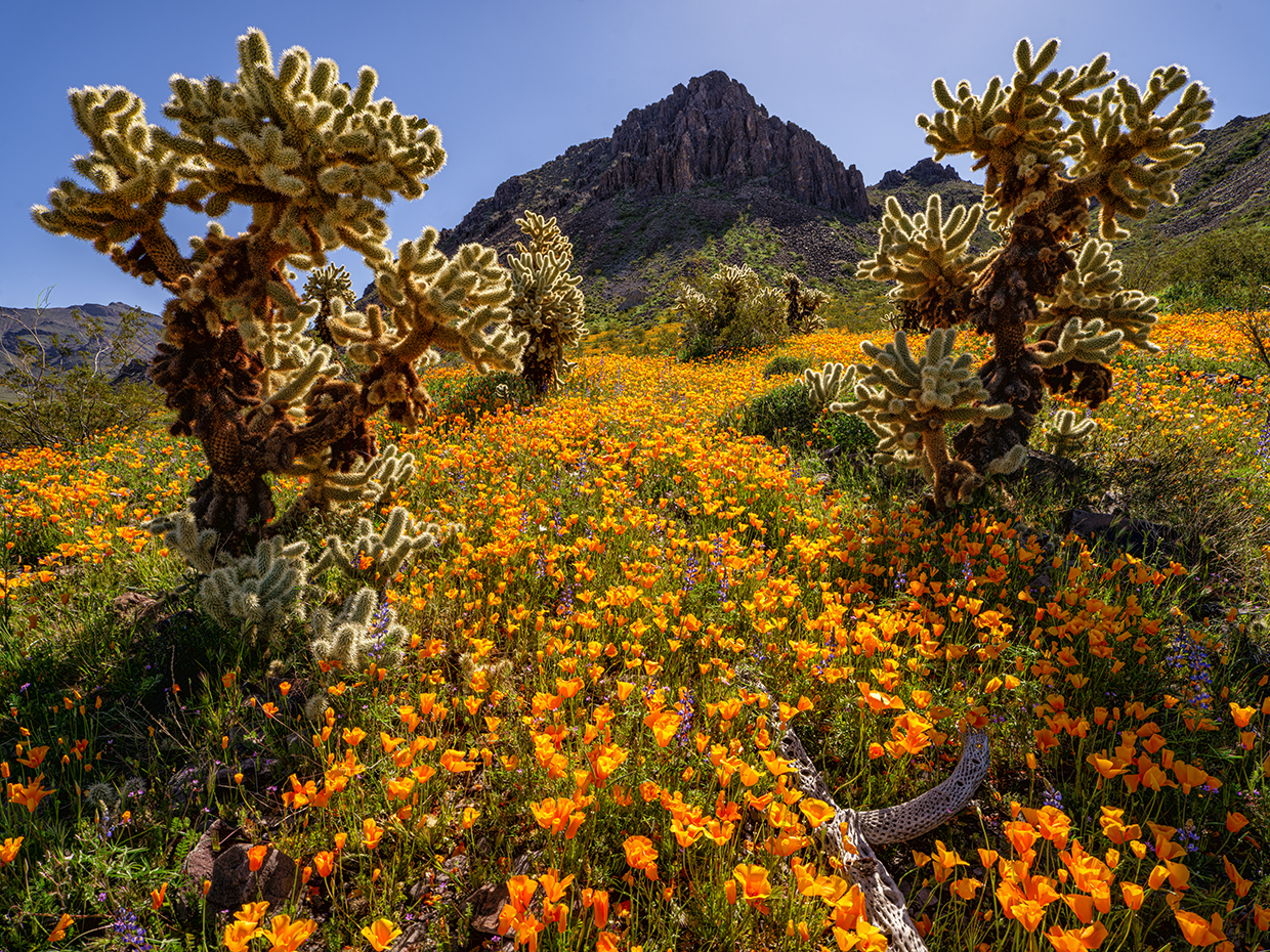 Mexican goldpoppies and lupines decorate a meadow dotted with teddy bear chollas in the Black Mountains of Western Arizona. This location is near the old mining town of Oatman, now a tourist destination known for its free-roaming burros.