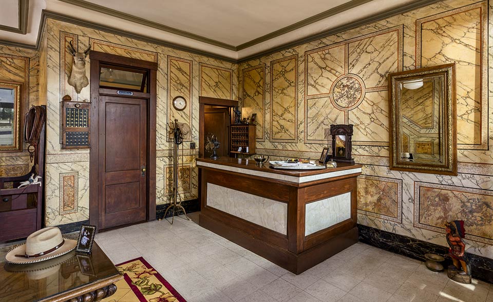 A brick extension added a faux-marble lobby (pictured) and more than doubled the number of guest rooms in 1915. The Bruno family purchased the hotel in the late 1920s or early ’30s and operated it for decades as a railroad hotel, catering primarily to railroad employees and ranchers. Having lost its primary clientele after the railroad pulled out of Douglas, the family closed the hotel in 1973 and used the building as a private residence.