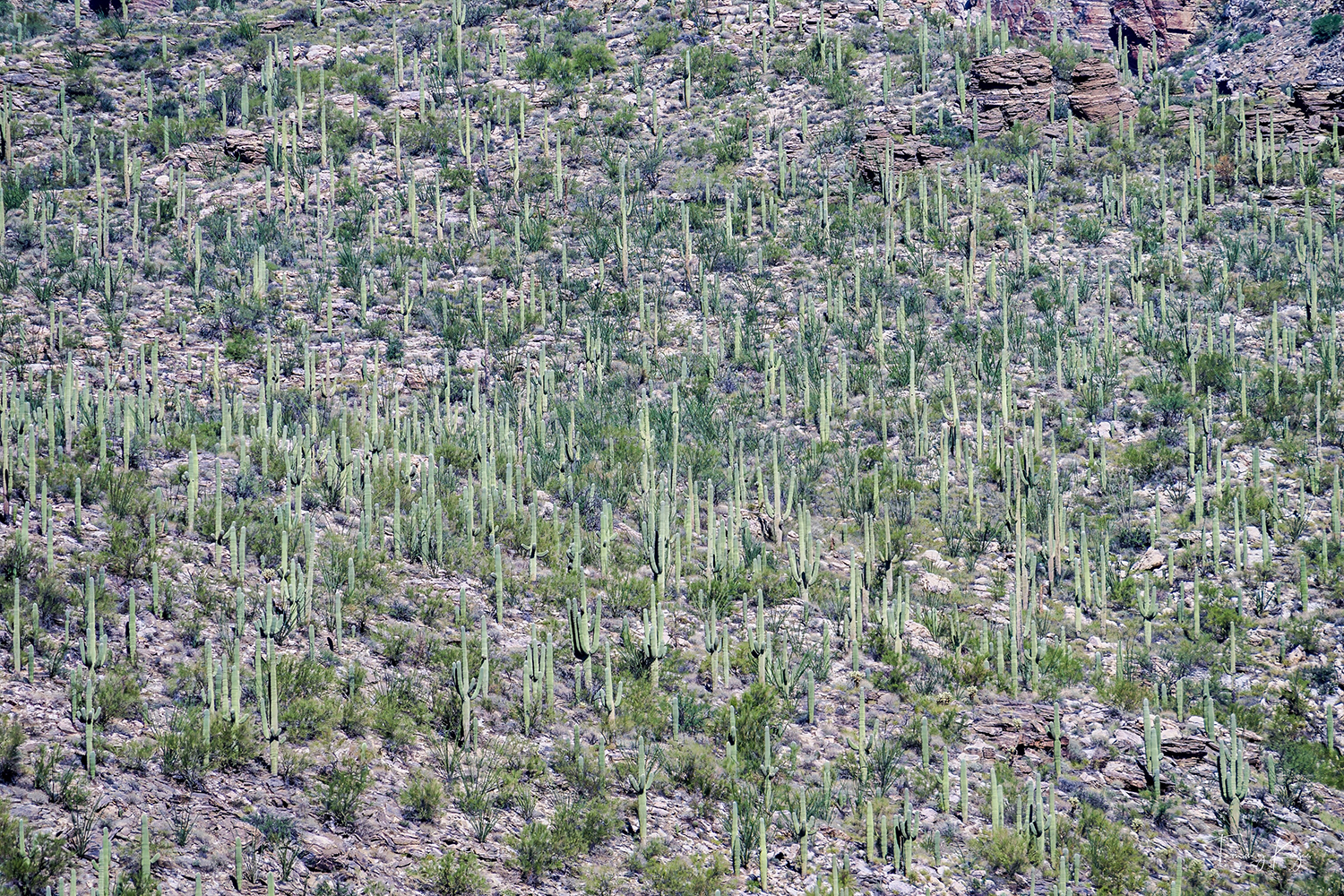 Saguaro cactuses fill a vast desert landscape in the foothills of the Santa Catalina Mountains.