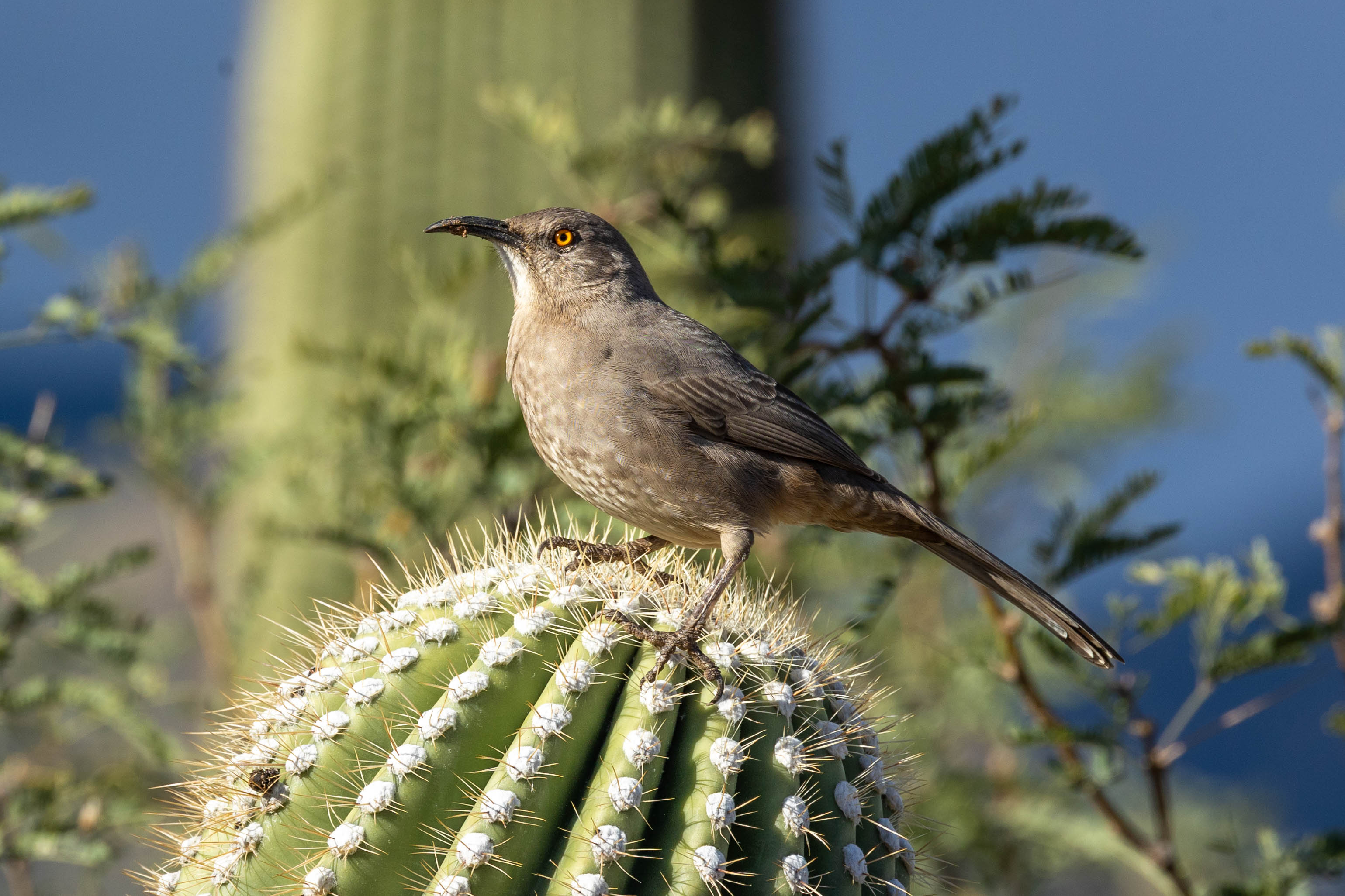 Curved-bill thrasher takes in the view from a saguaro cactus at Sabino Canyon in Tucson.
