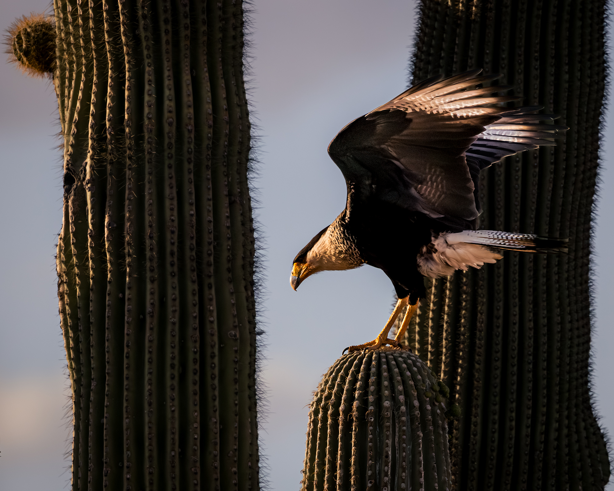 A crested caracara drops onto a saguaro crown during the last heat of the day, its wings catching the warm desert light as it settles into the iconic Sonoran landscape.