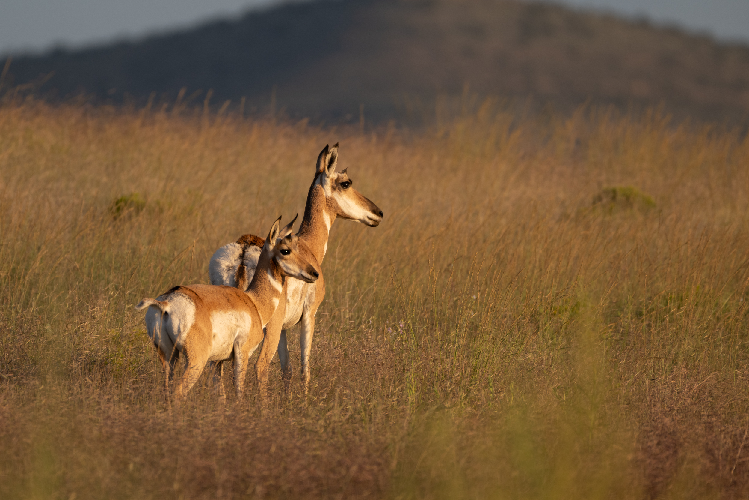 American Pronghorn doe and calf bathed in the dawn golden light in Chino Valley Arizona
