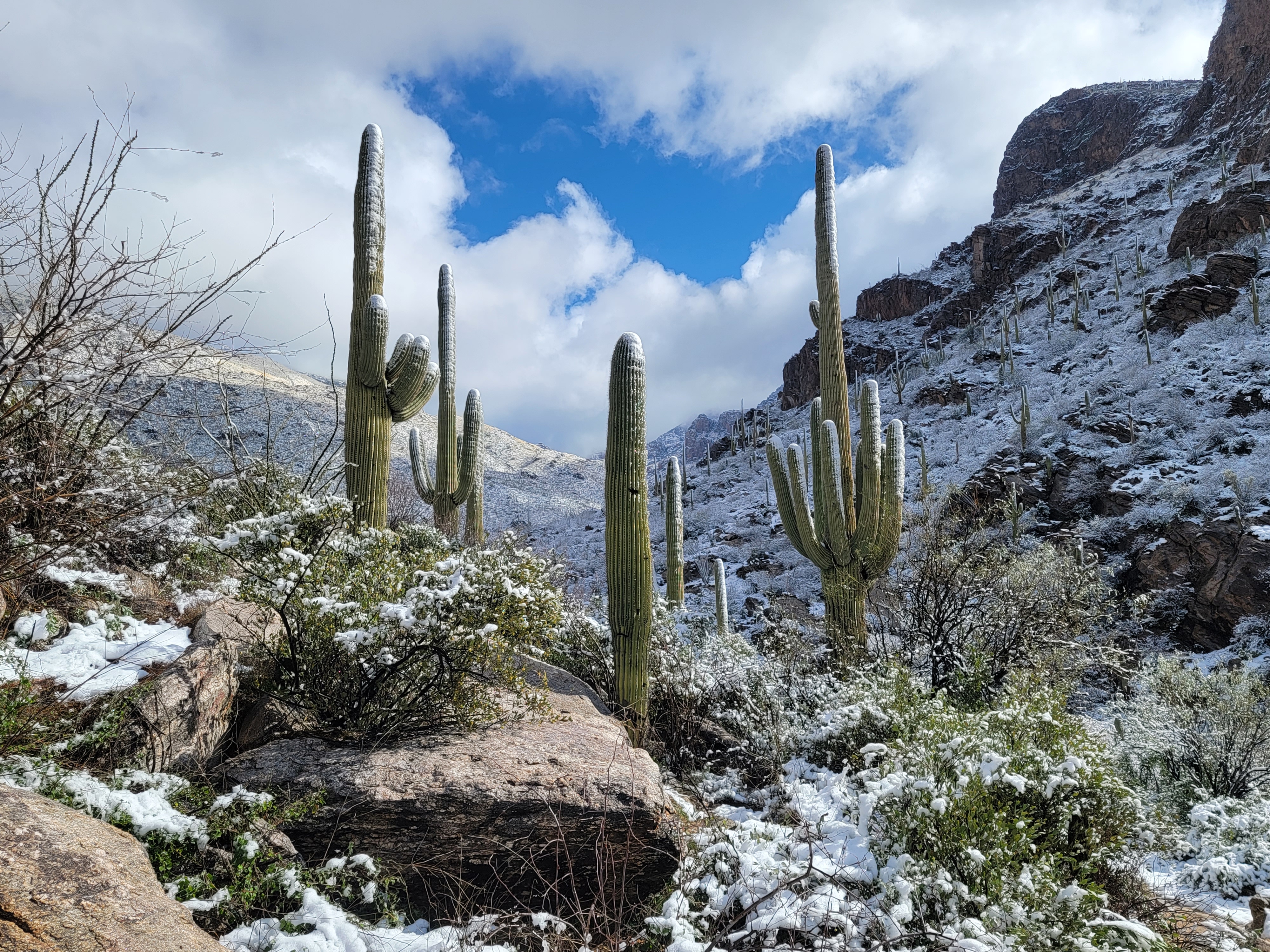 Rare and striking scene of tall saguaro cacti standing amid a desert landscape blanketed in fresh snow, Tucson, Arizona