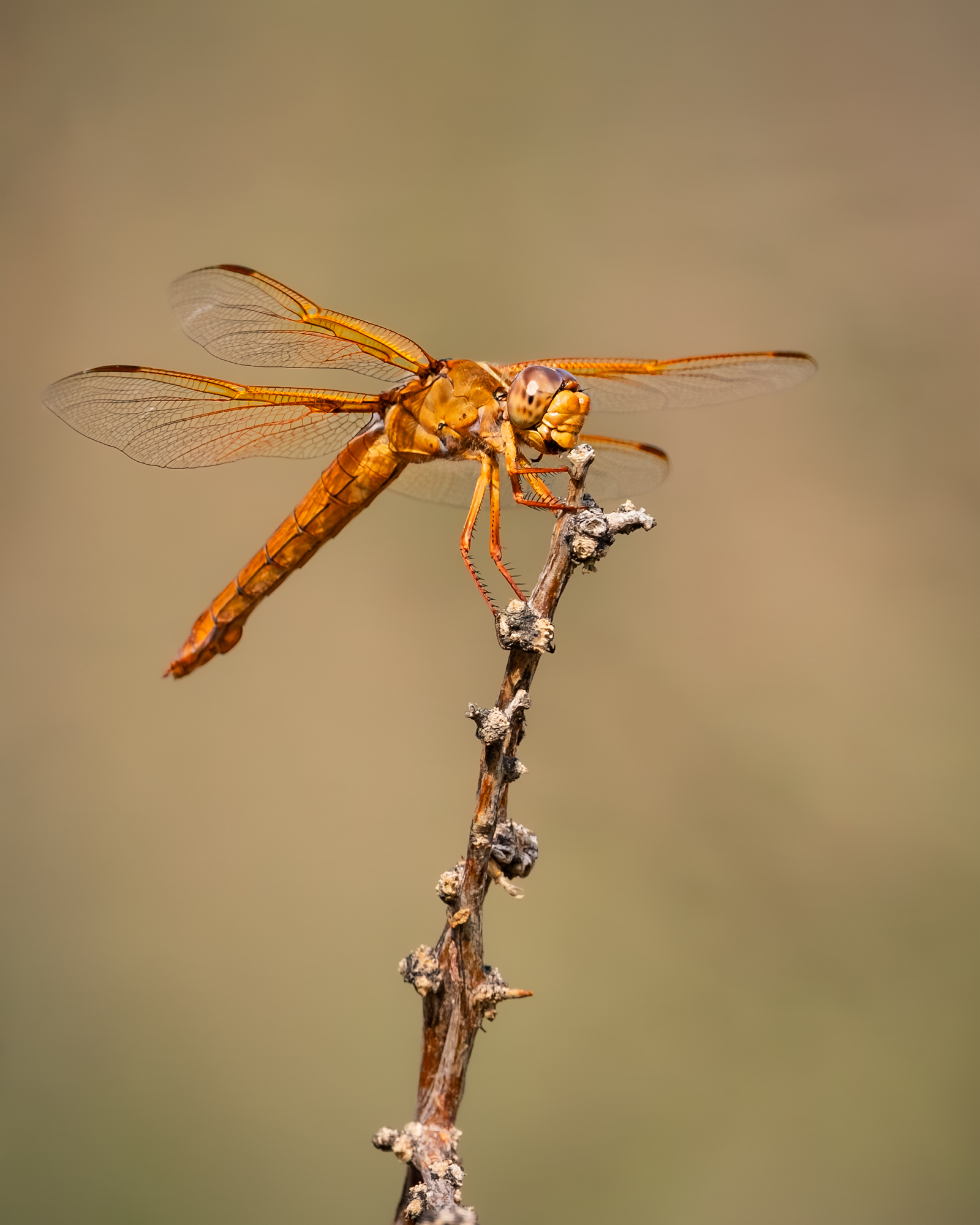 A desert dragonfly pauses on a sunlit perch during a hot summer morning in southern Arizona, its wings glowing against the soft, muted backdrop of the Sonoran Desert.