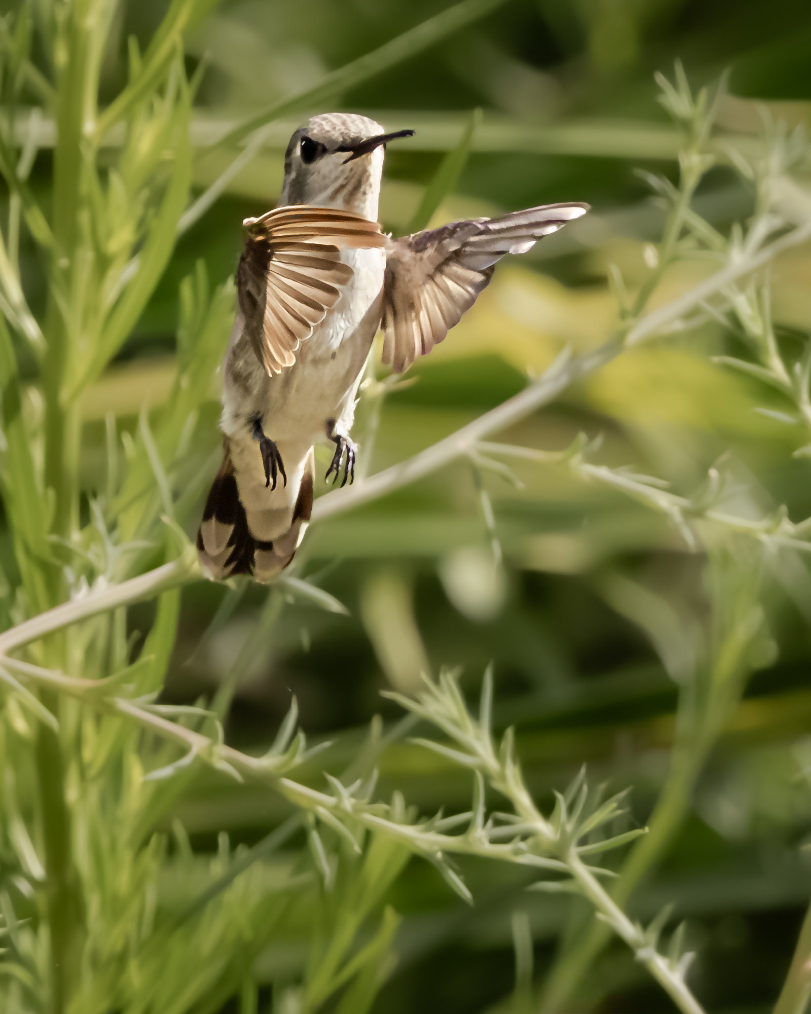 A hummingbird pauses in midair among the desert foliage, lifting one wing as if signaling its next move before disappearing back into the summer greenery.
