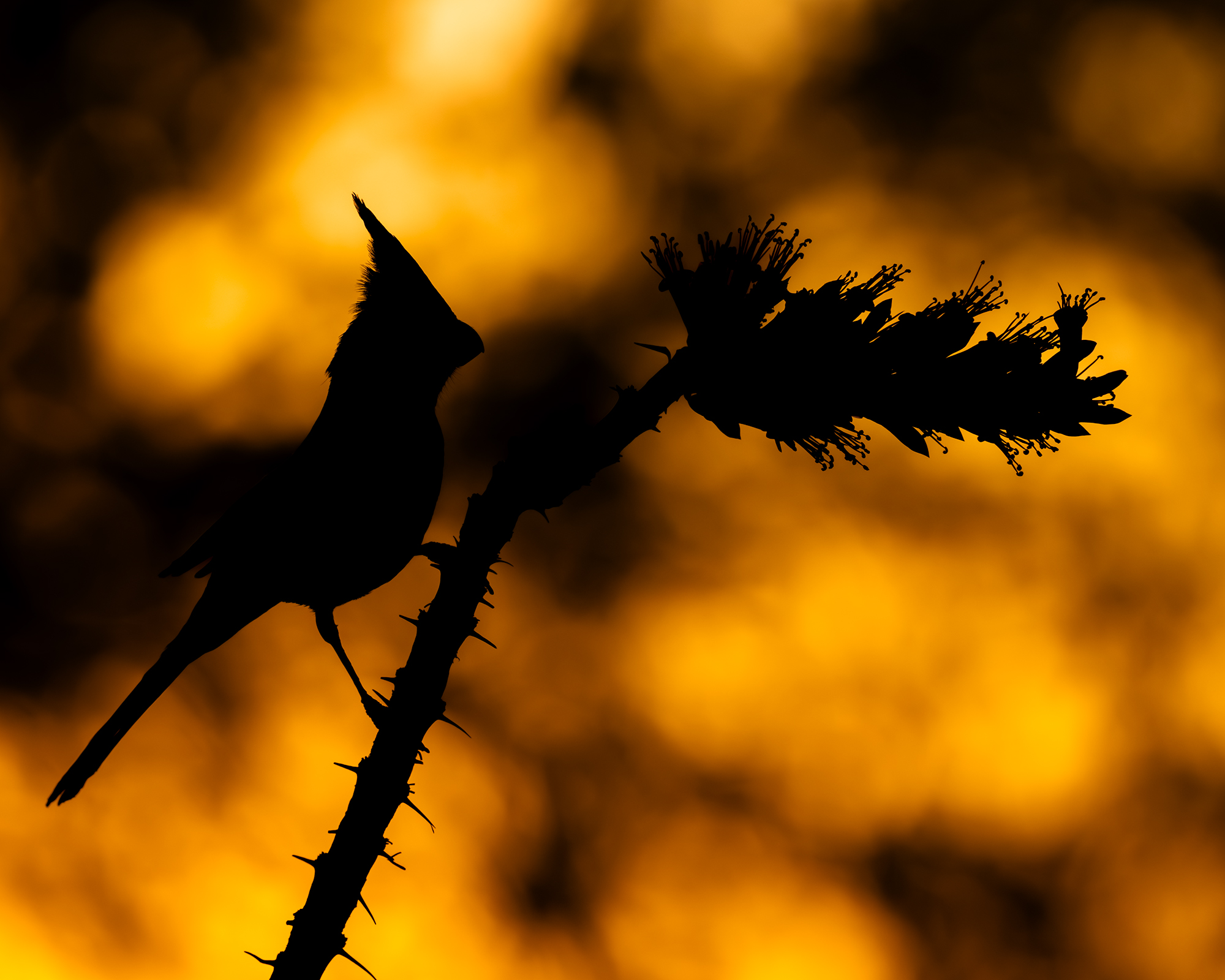 A Pyrrhuloxia perched on ocotillo, silhouetted against an Arizona sunset glowing with desert fire.