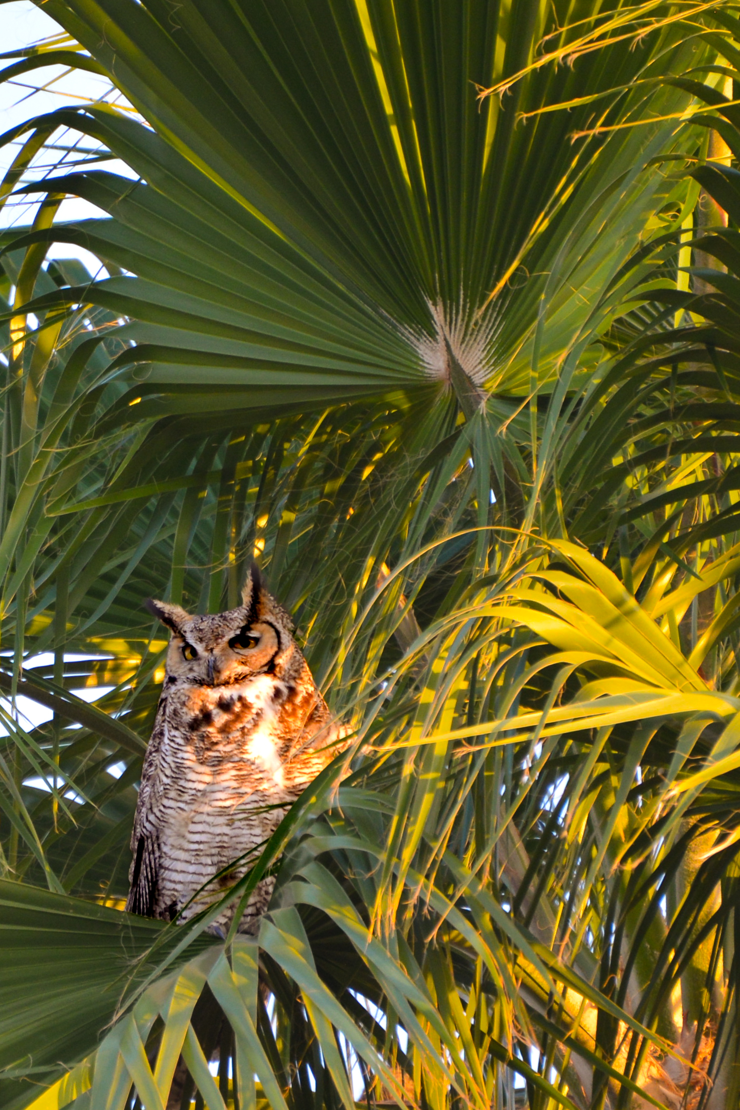 A great horned owl emerges from the fronds of a palm tree at twilight.