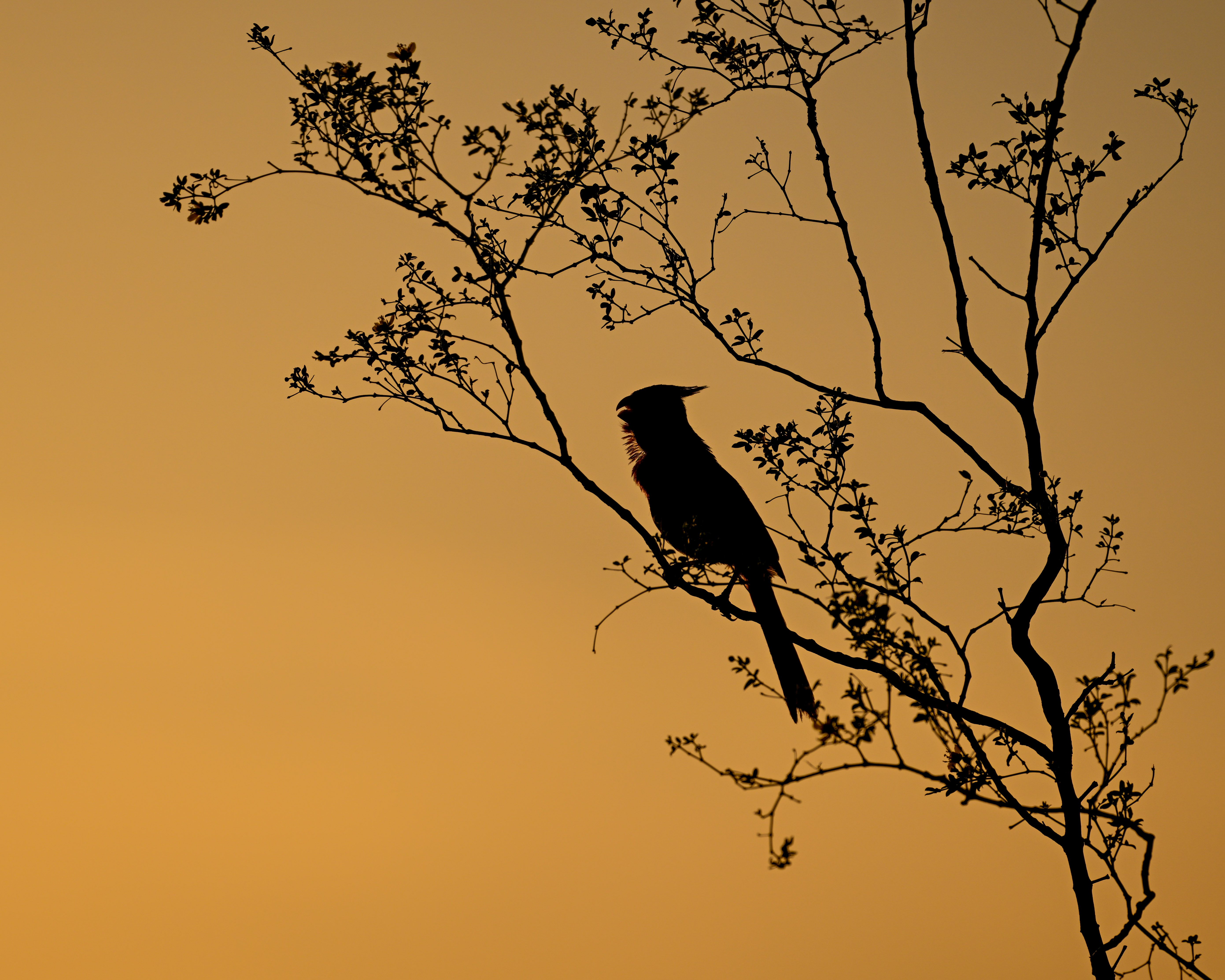 Silhouette of a Pyrrhuloxia against the golden sunrise
