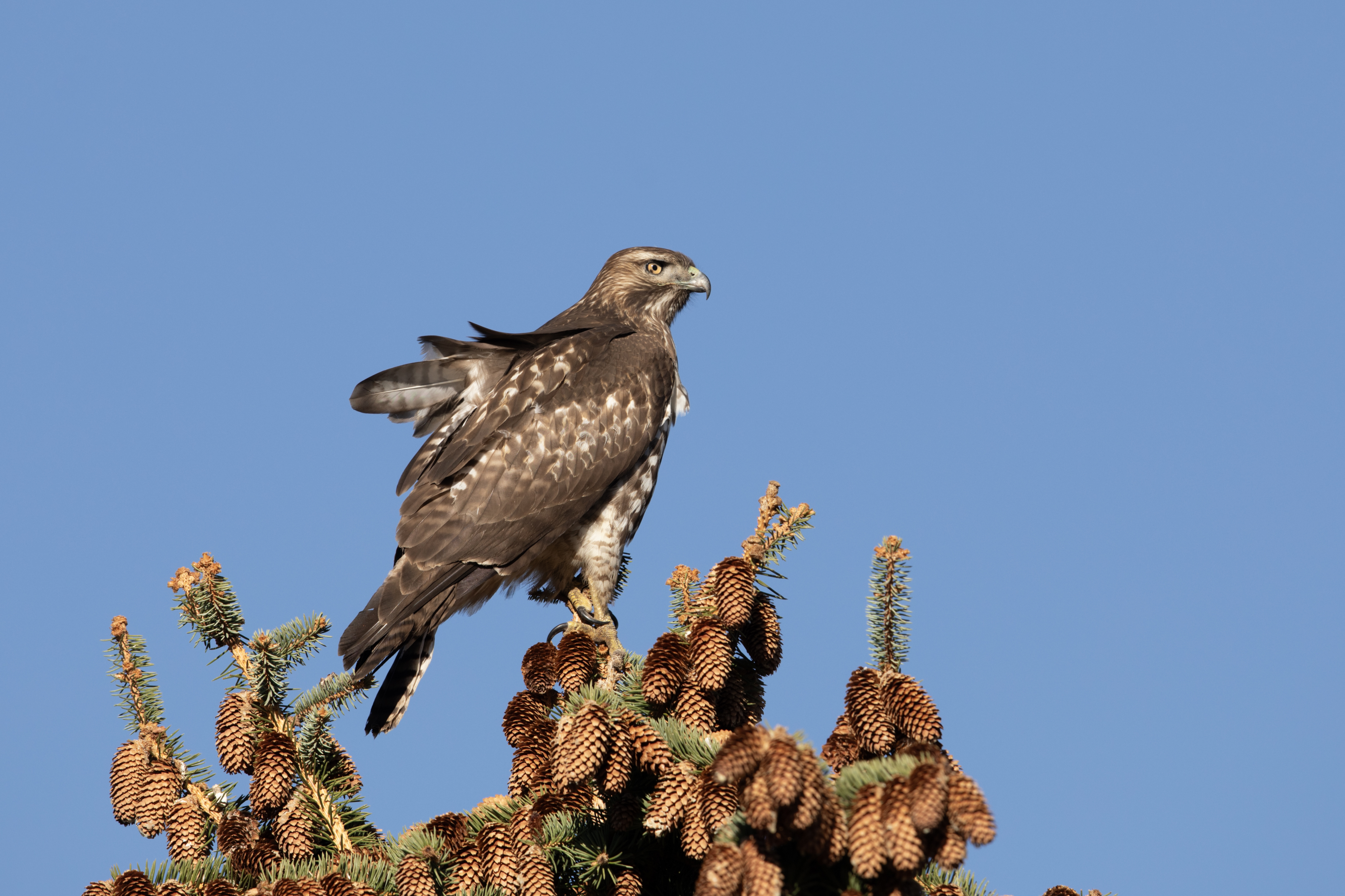 Red Tailed Hawk perched on a spruce tree.