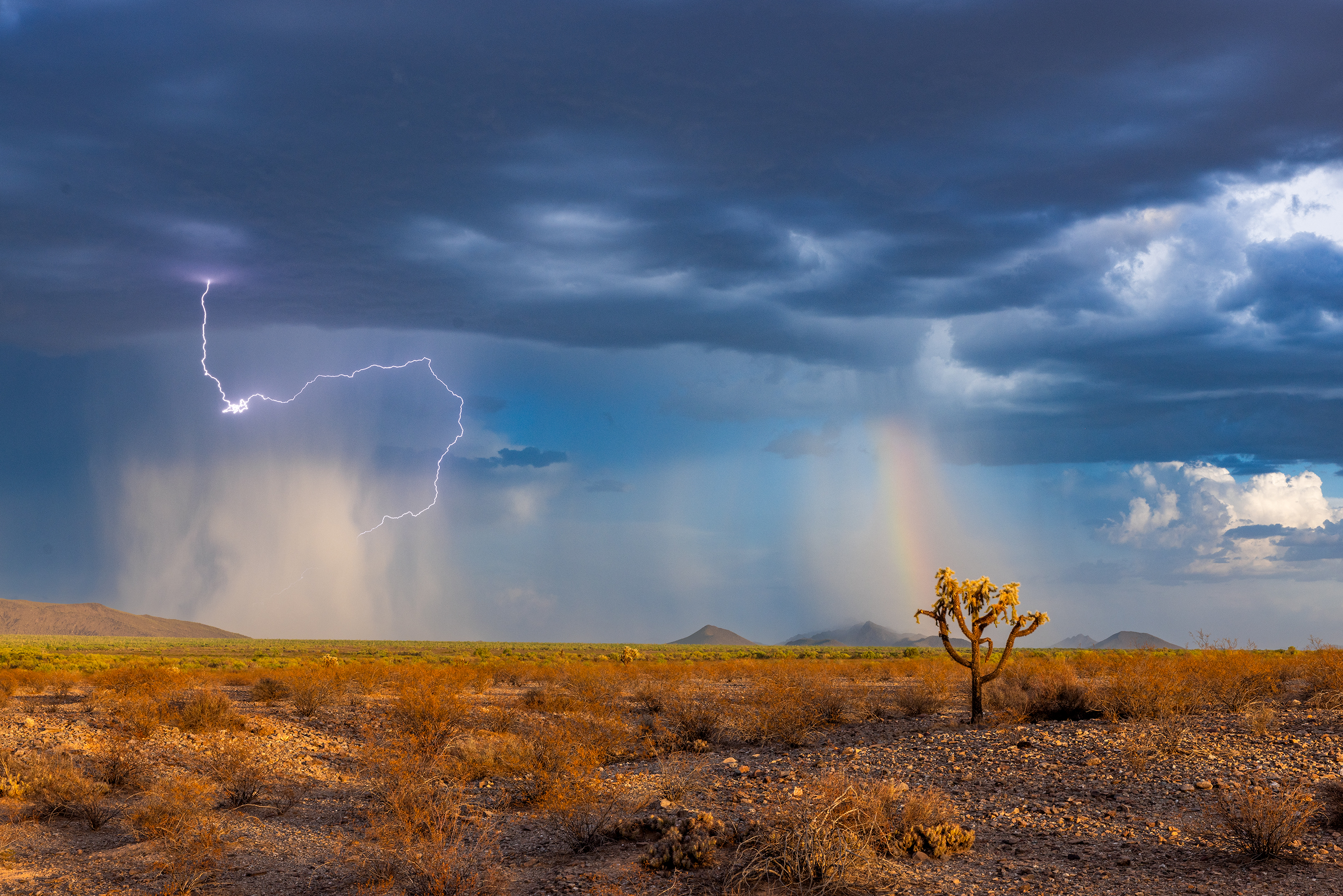 A Monsoon storm at sunset brings lightning, rain, and a partial rainbow to the desert in July of 2025.