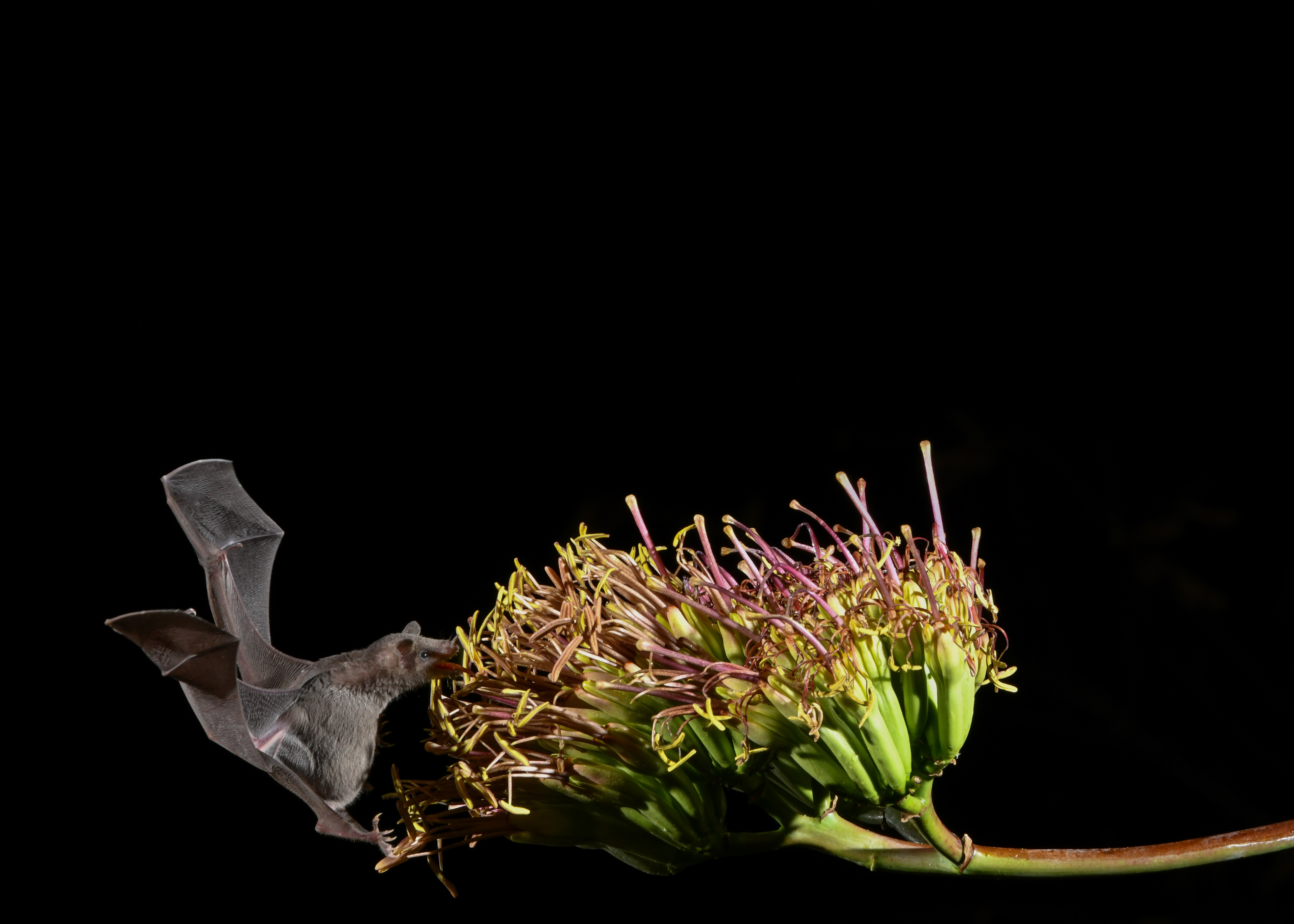 A lesser long-nosed bat feeding on an agave plant at night in Madera Canyon.