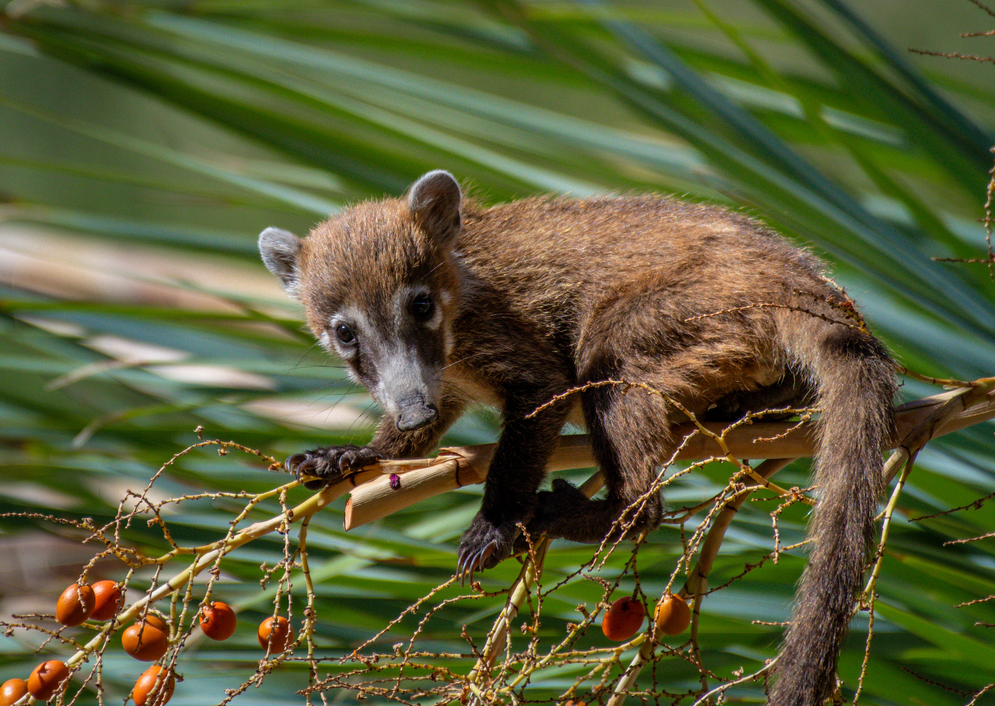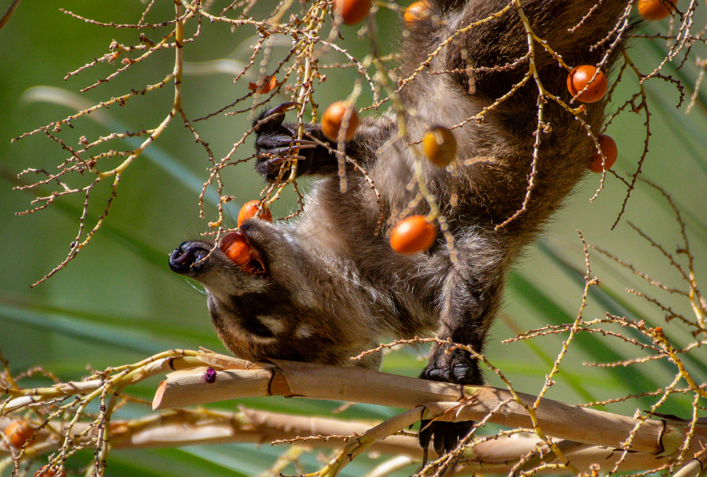 Whatever it takes! Baby coati does an upside-down balancing act to grab a snack.