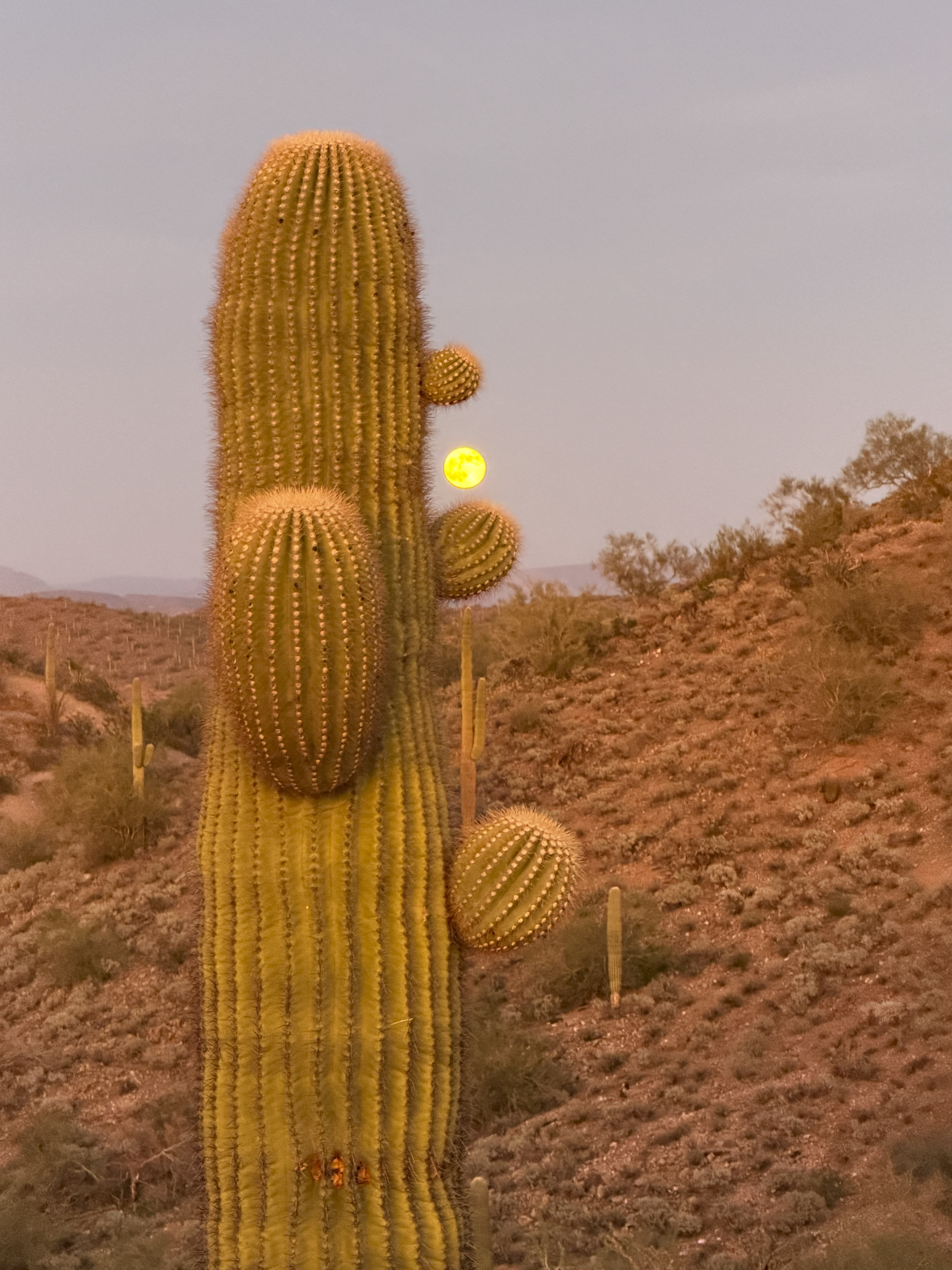 Full Moon rising over Sonoran Desert framed by Saquaro.