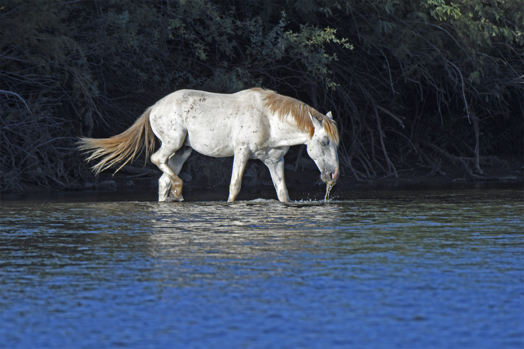 A wild stallion on the Lower Salt River in Mesa snorkels for eel grass.