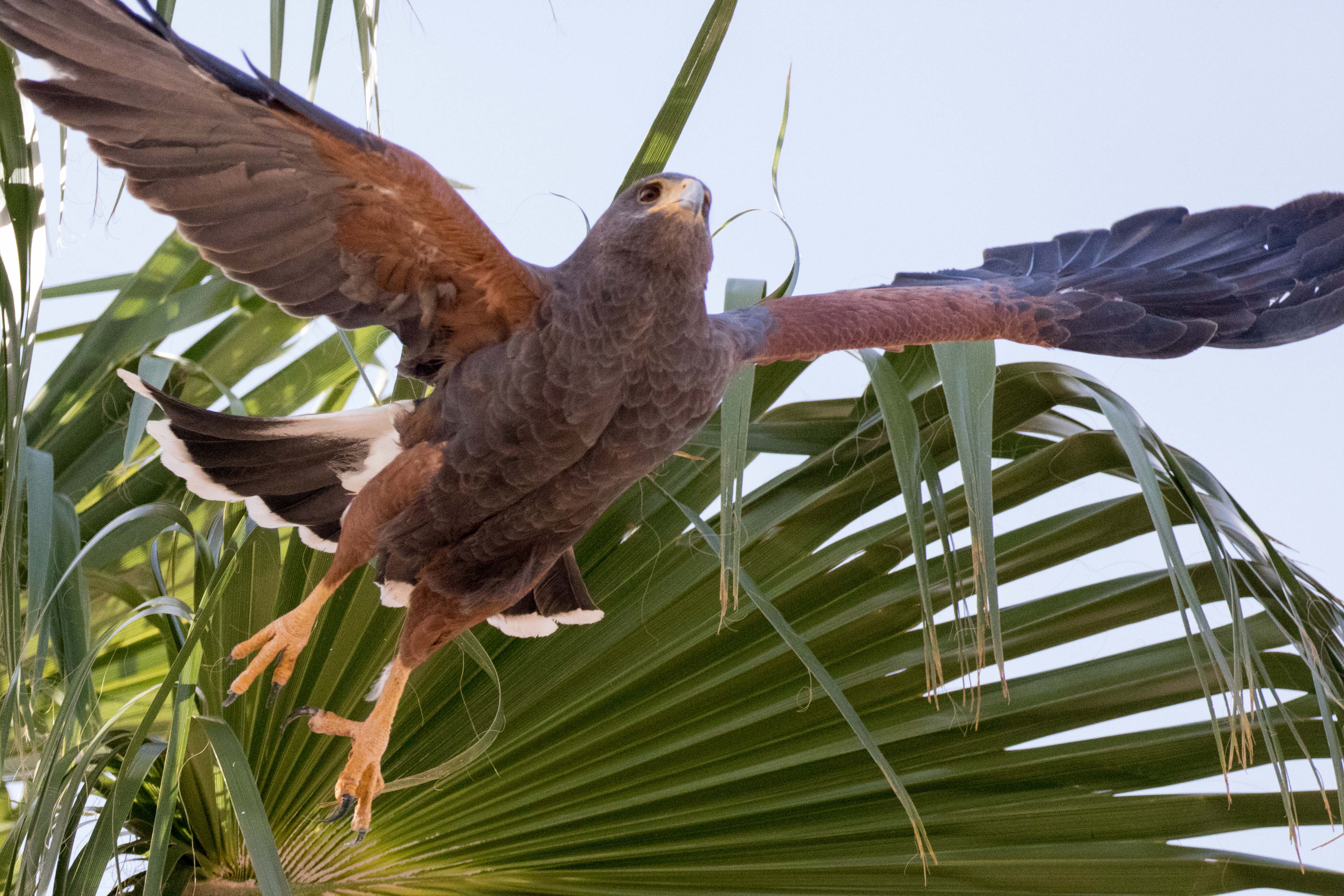 A Harris's Hawk takes oof in fight from a Palm Tree