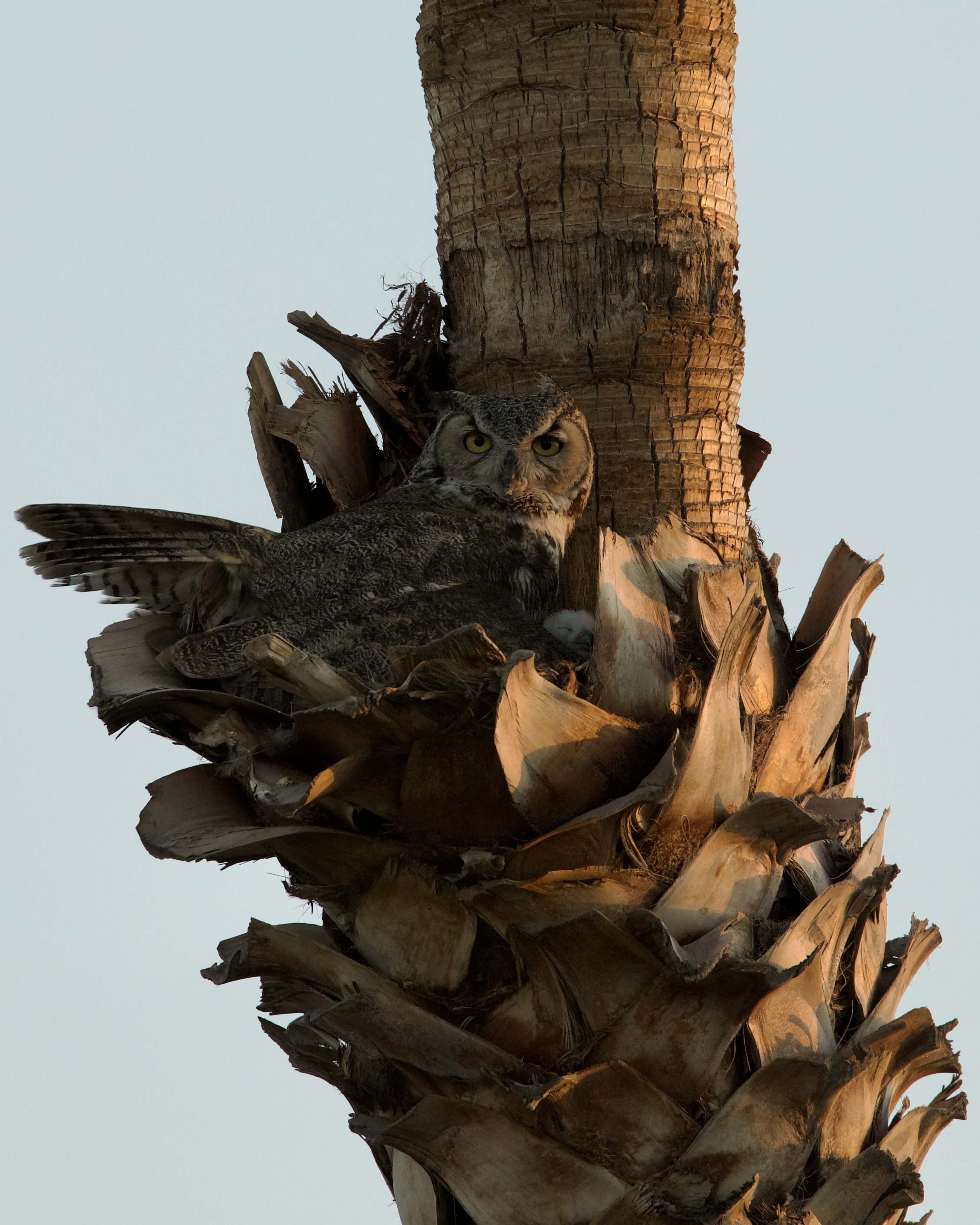 Mother Great Horned Owl exposing her few days old chick to the camera for the first time.