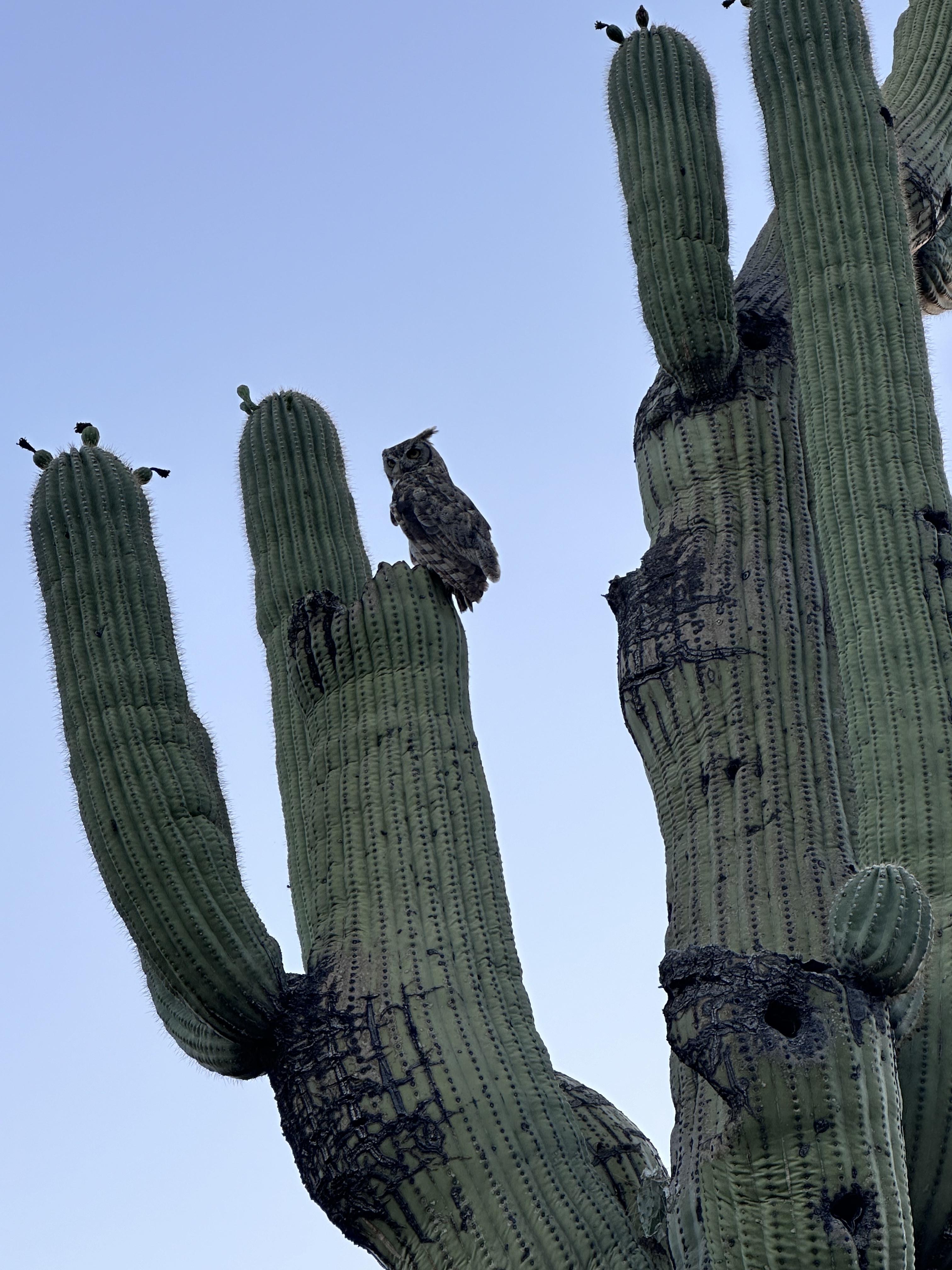 Great Horned Owl perched on a saguaro cactus