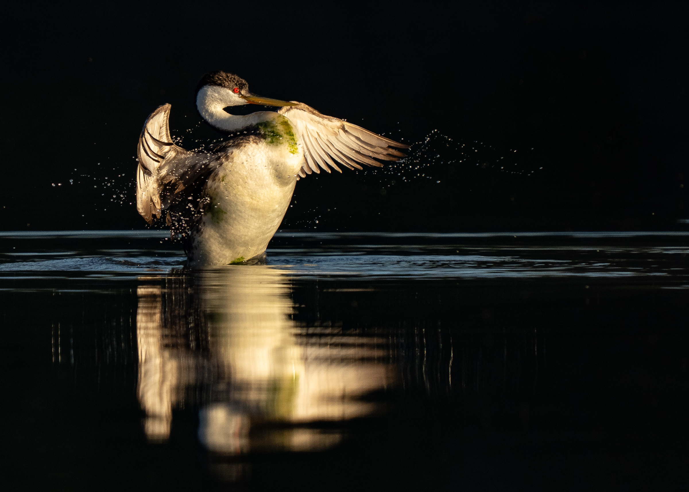 A western grebe revving its engines in the early morning light