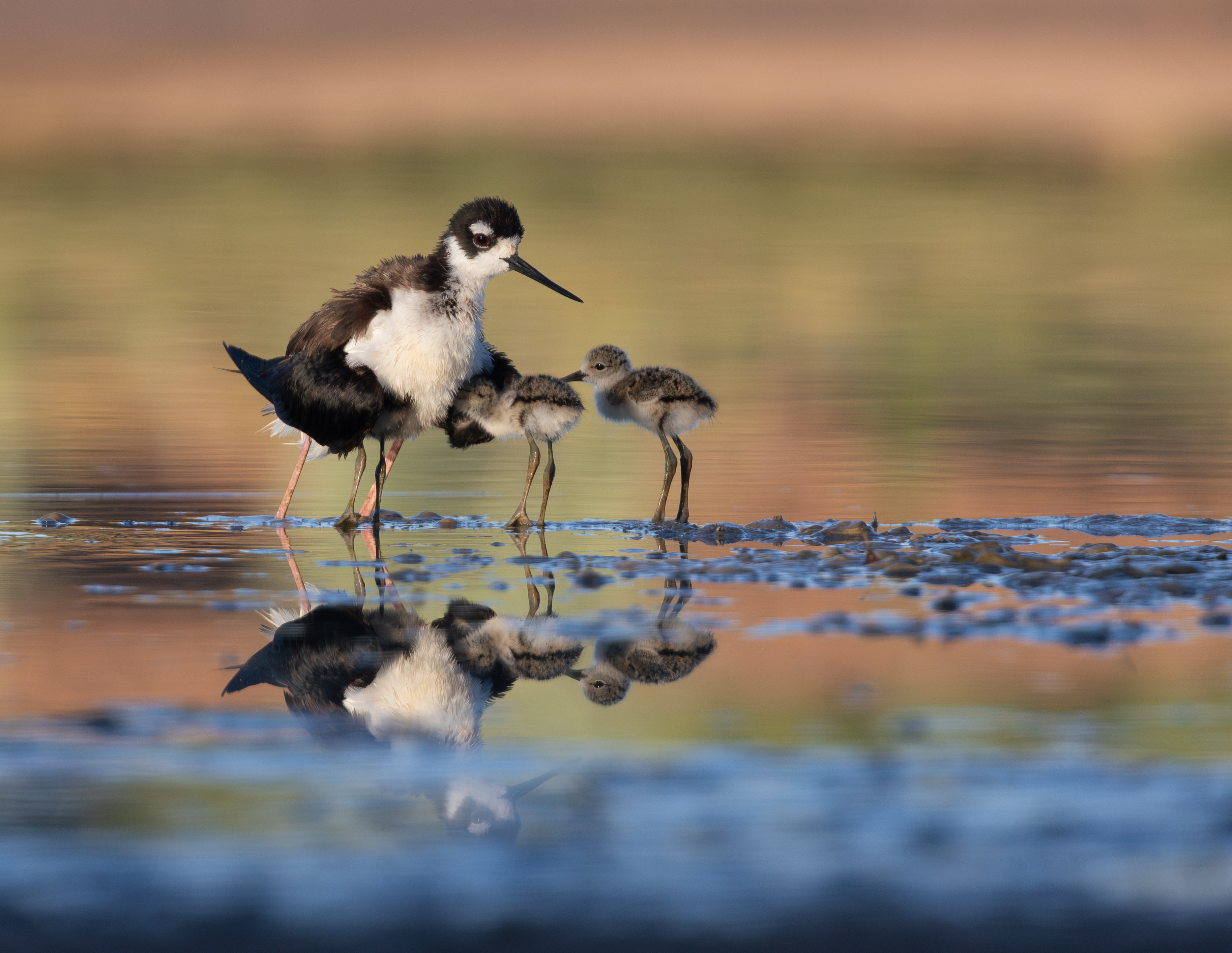 The early morning light was wonderful for this Black-necked Stilt mom and 3 4-day-old chicks (count the legs!). Black-necked Stilts can thrive in Arizona if a pond has a consistently low water level.