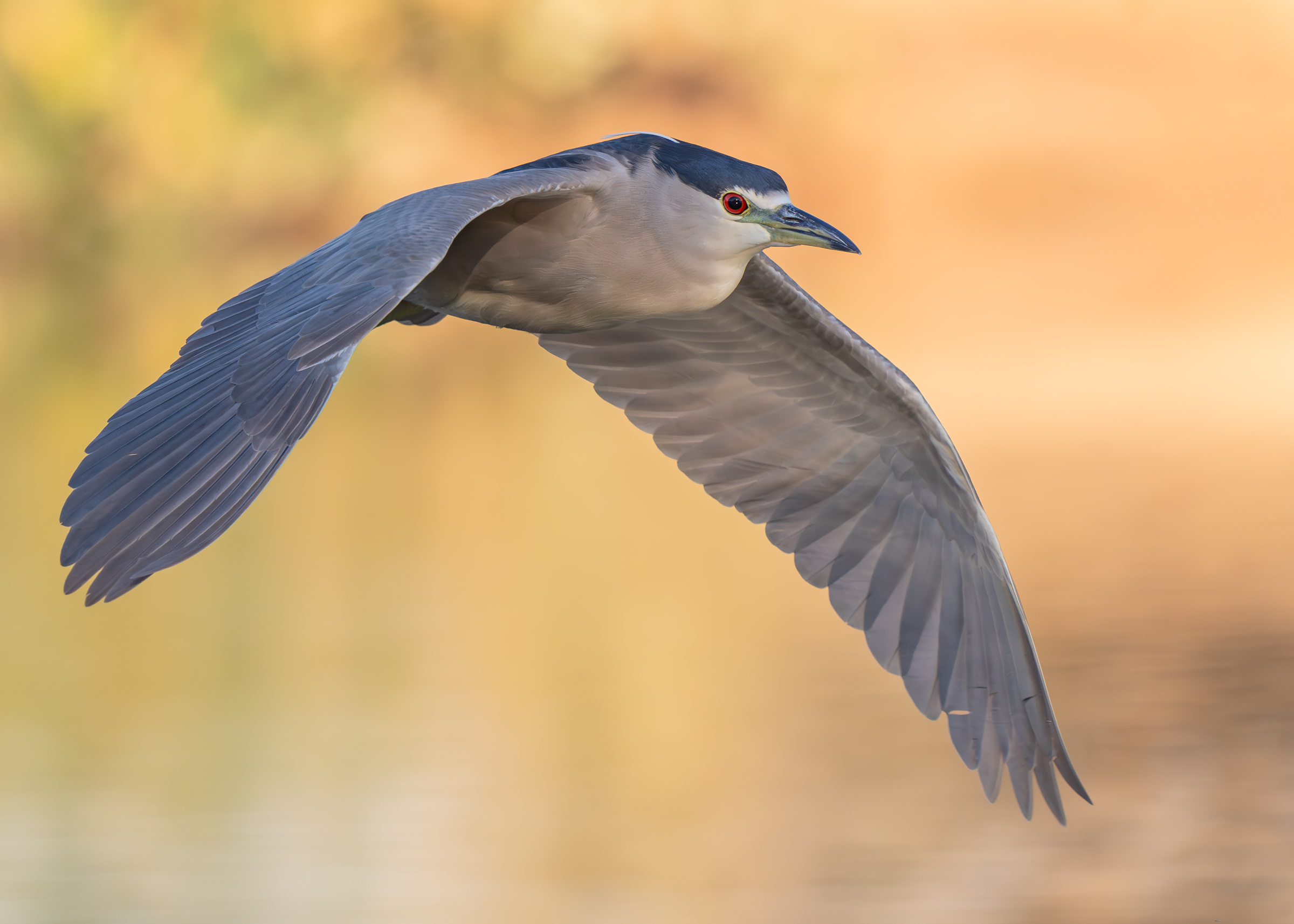 A black-crowned night heron soaring over a pond