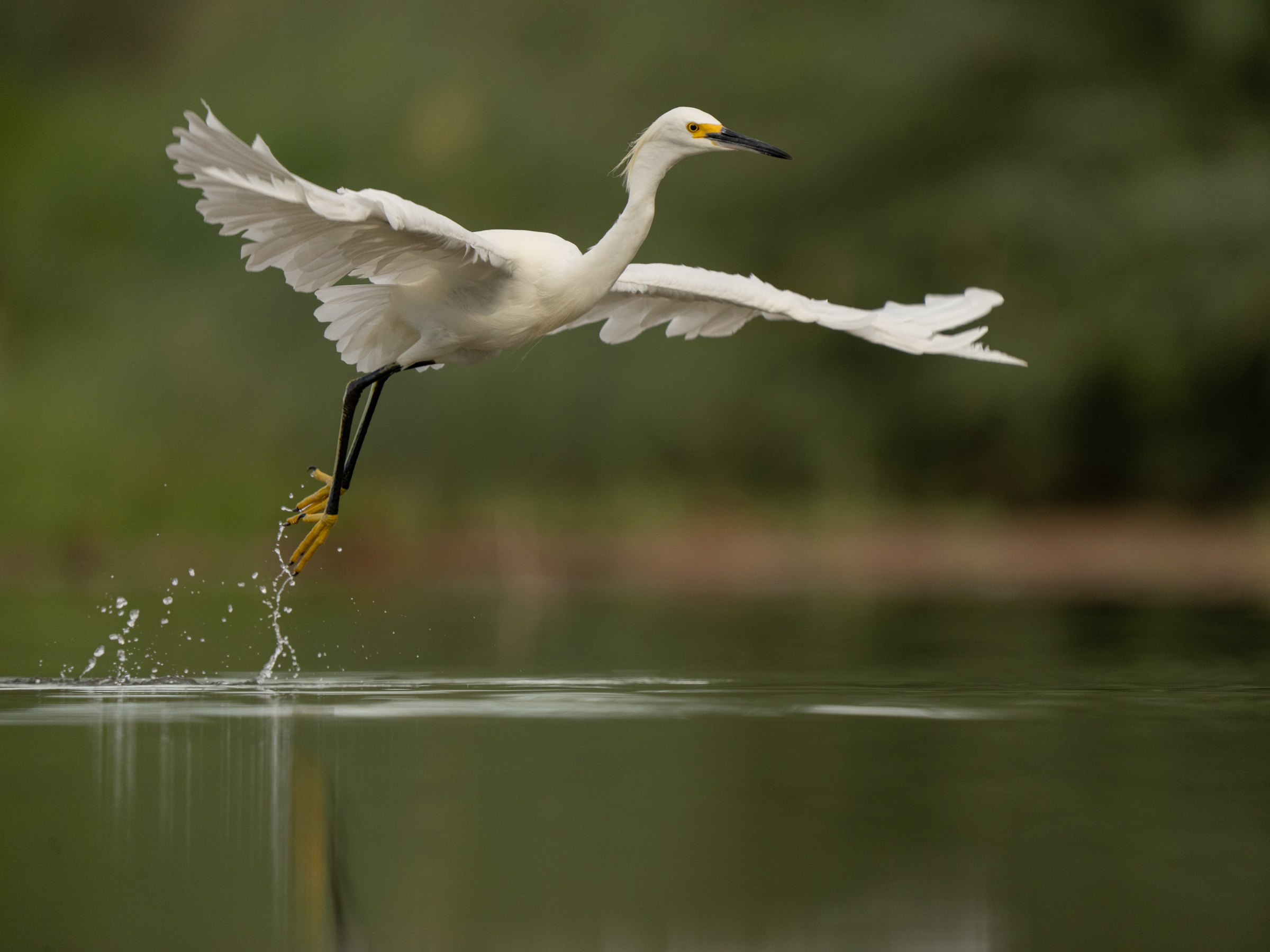 A snowy egret dancing across a pond