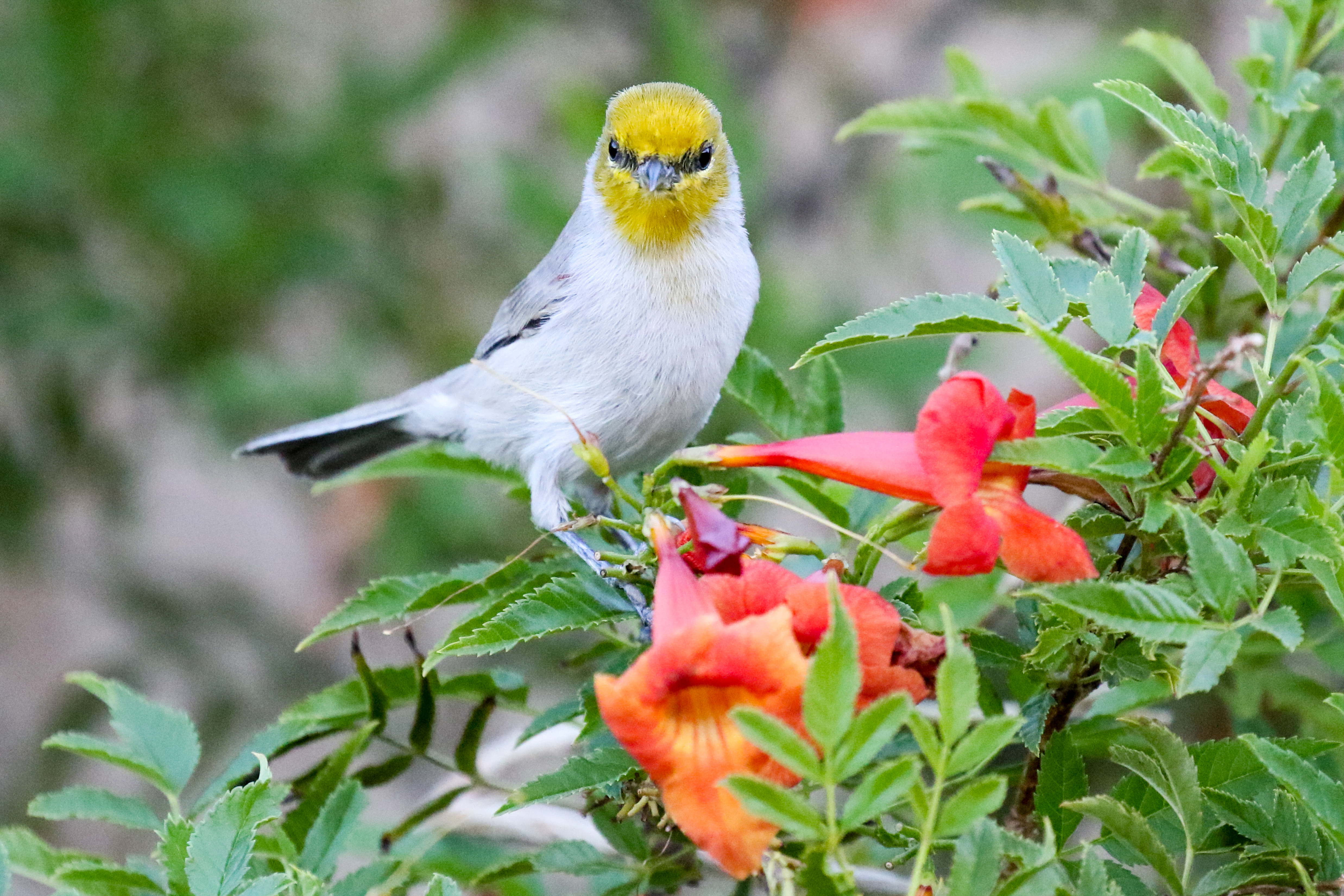 A Verdin sits on a Bells of Fire Tecoma plant