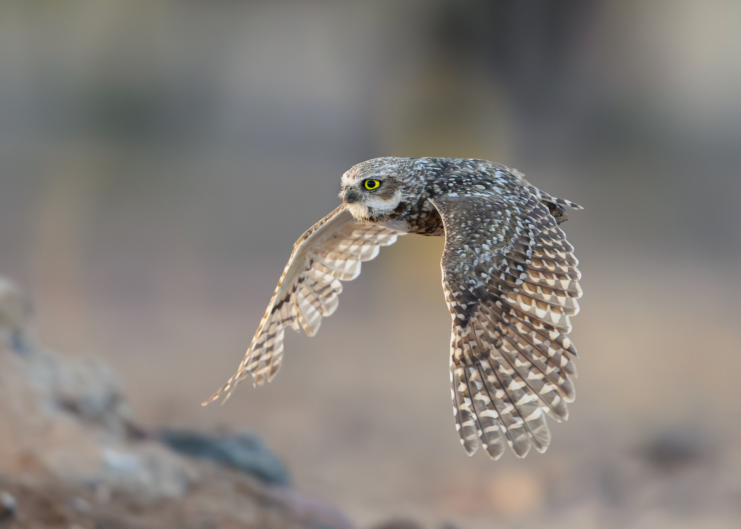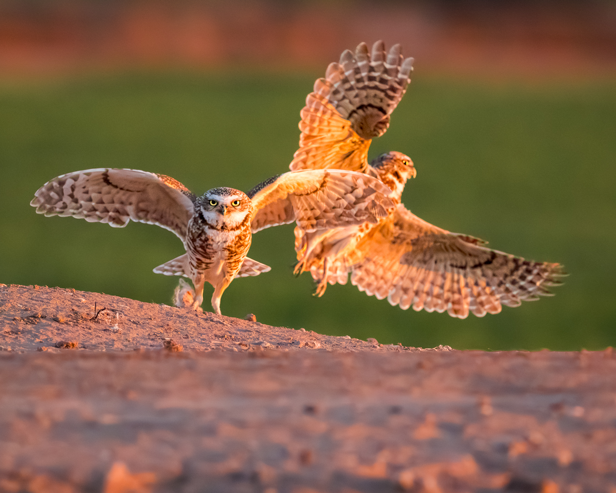A pair of Burrowing Owls react to a nearby intruder, one standing guard as the other launches skyward in defense of their burrow under Arizona’s golden light.