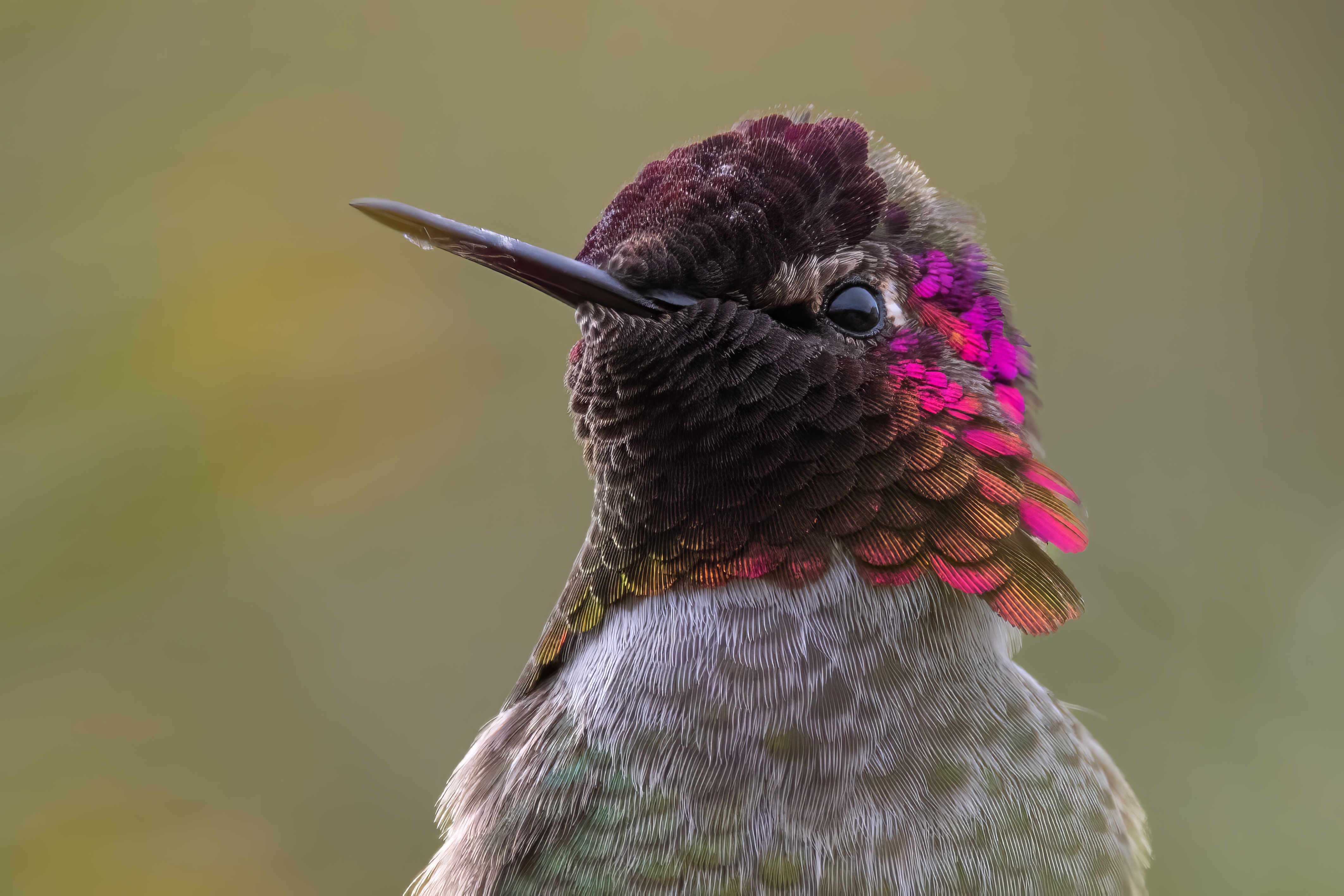 Closeup of a male Anna's Hummingbird showing off his colorful gorget