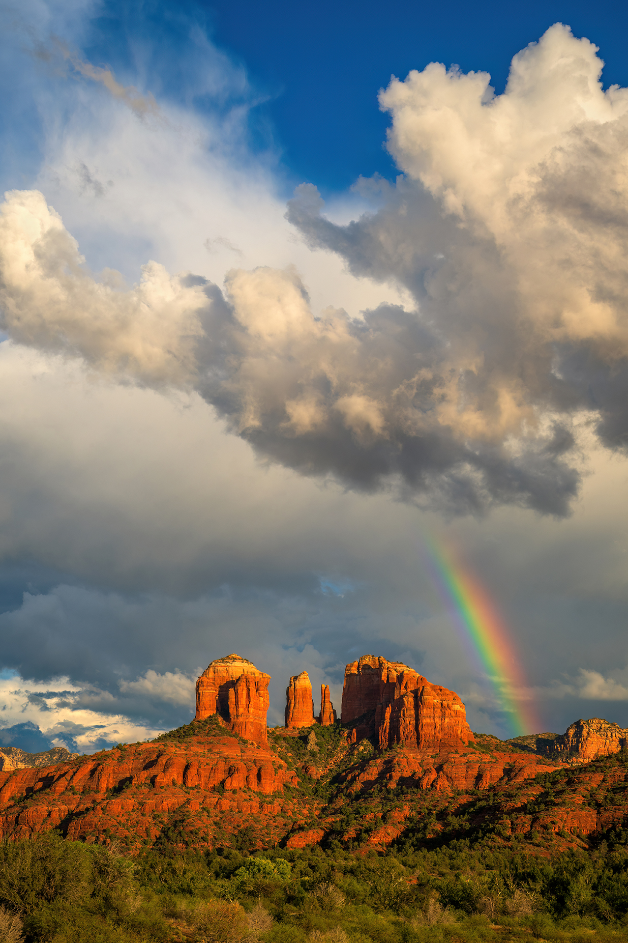 "The Wishing Cathedral (vertical):" Beneath billowing clouds and golden light, Cathedral Rock in Sedona held my birthday wish: a rainbow appearing just as the day drew to a close.