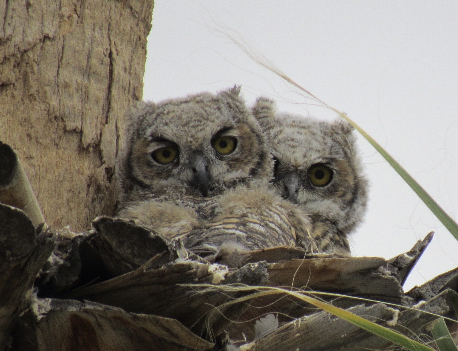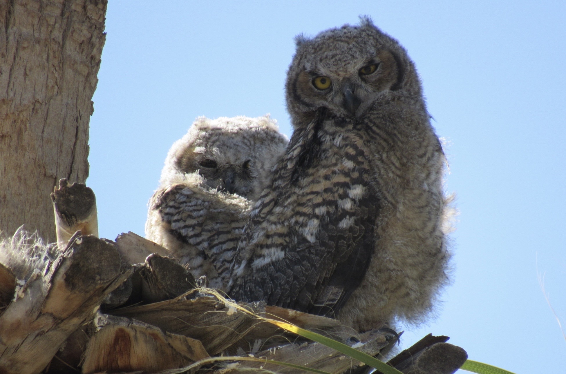 Young Great Horned Owl siblings in a nest half way up a palm tree.